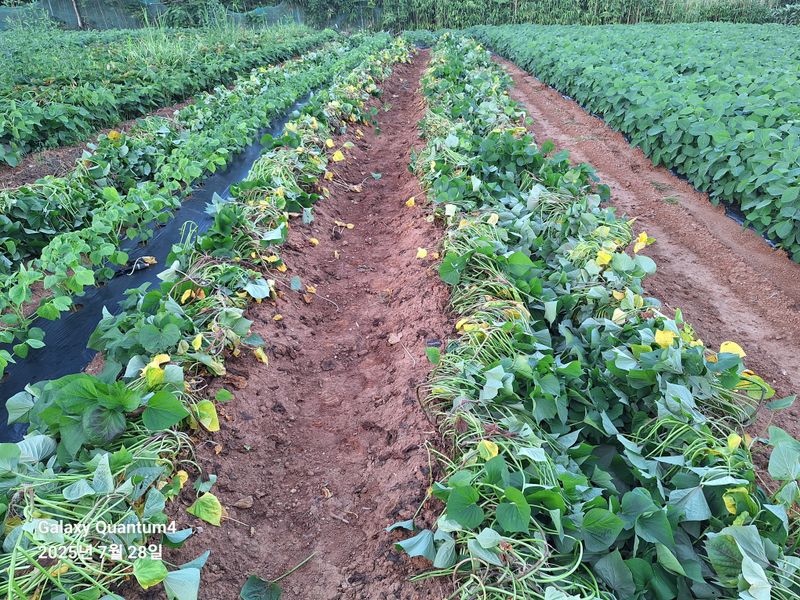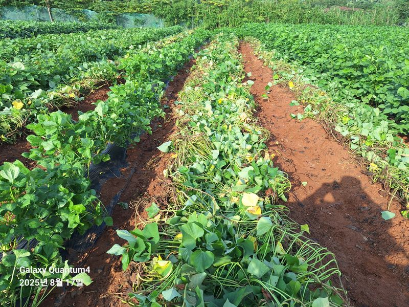 고구마 줄기 뿌리 뻗기 억제를 위하여 장맛비로 두둑과 고랑에 고구마 줄기가 뿌리를 내린 것을 들어서 뿌리를 뽑아서 줄기를 돌려놓았다.