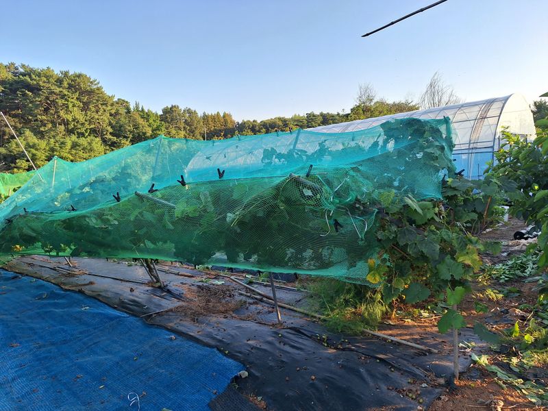 포도를 각종 새들이 쪼아 먹고 있어서 그냥 보고만 있을 수 없어서 그물치기 작업을 해 놓았다. 일부는 새그물을 쳤고 일부는 일반 그물을 쳐 놓았다. 새 그물은 미리 쳐 놓았는데 새 그물에 풍뎅이가 달라붙어 그물을 망쳐놓았다. 풍뎅이가 이렇게 크고 많이 있는지 처음 알았...