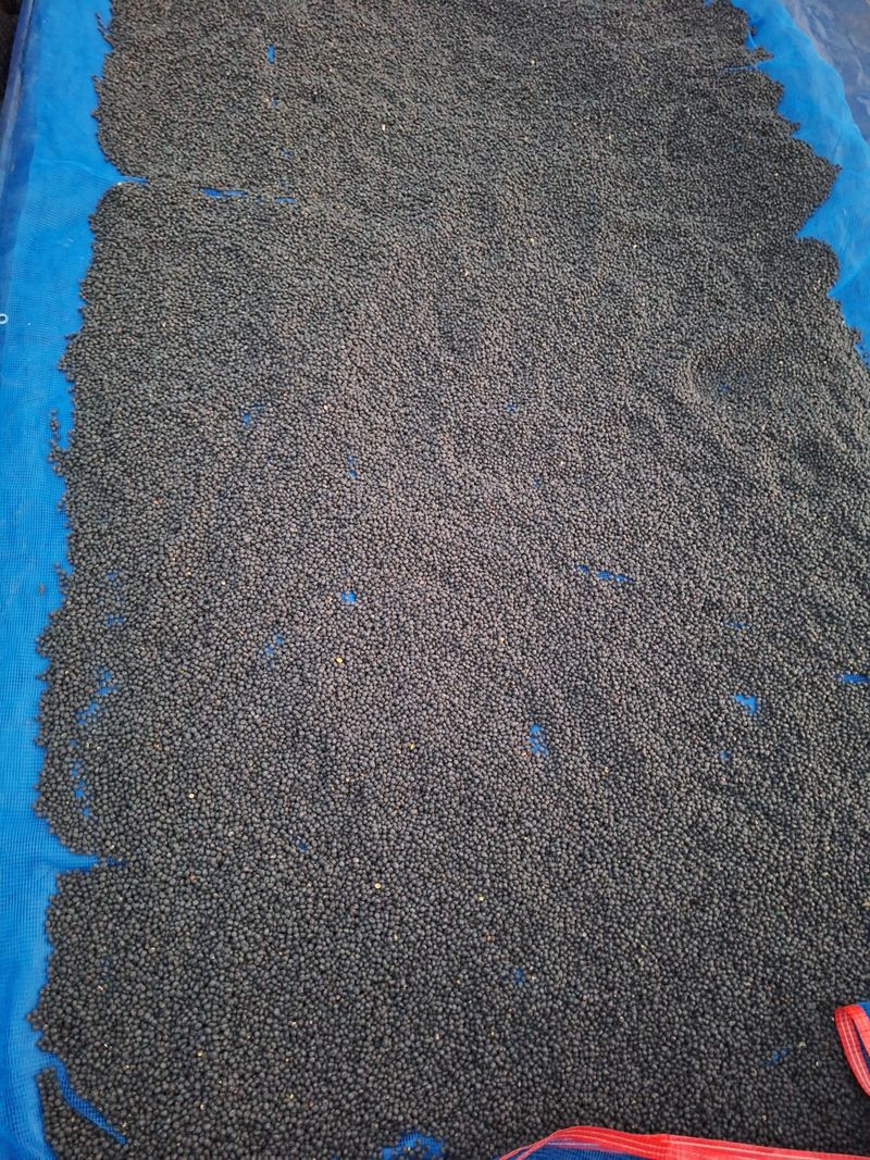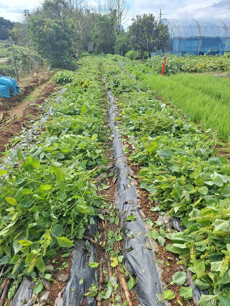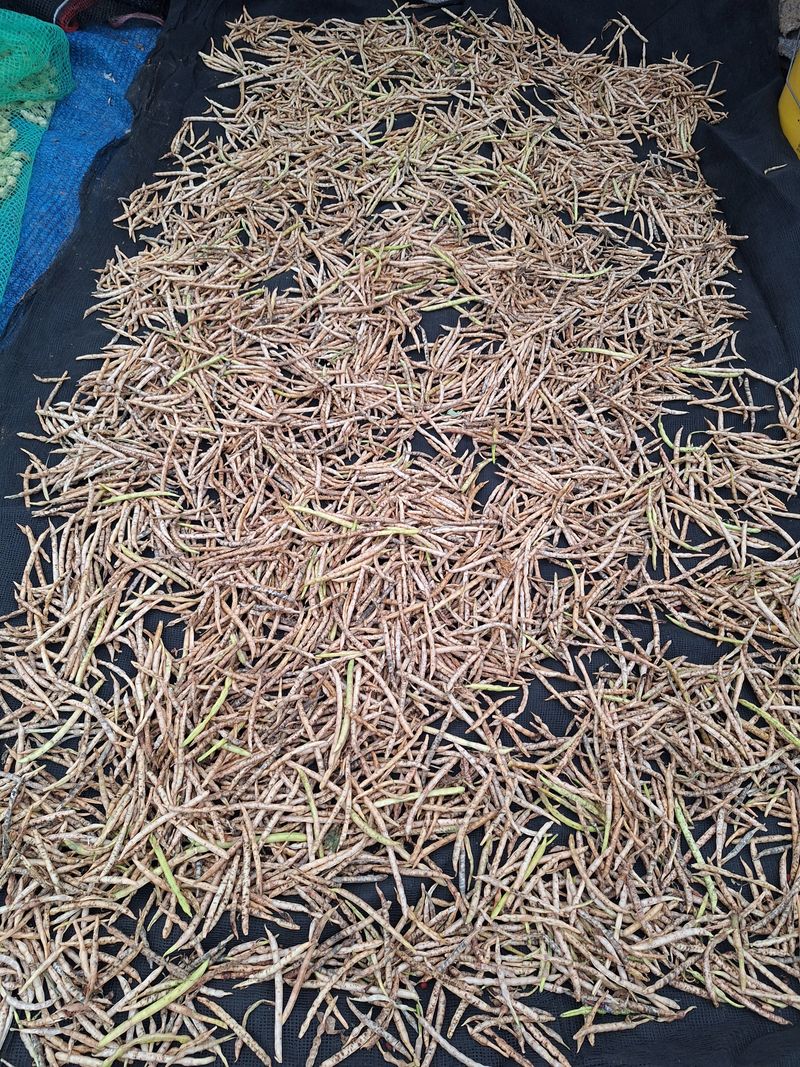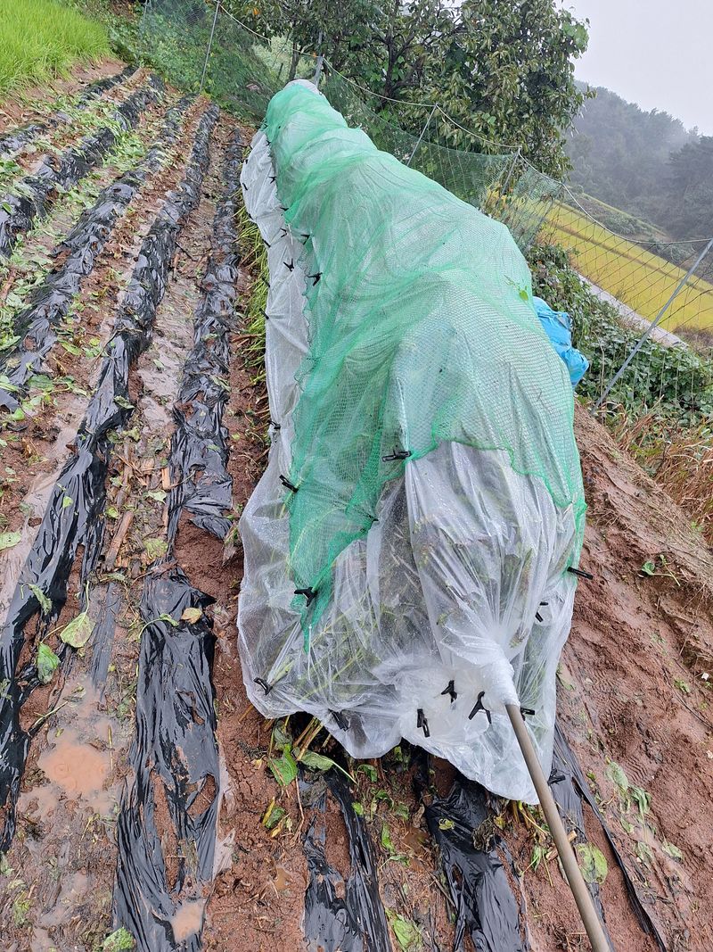 1) 팥 밭에서 익은 팥 꼬투리를 45L를 수확해서 하우스 안에 널어 놓았다. 2) 들깨를 수확하여 단으로 묶어서 거치대를 설치하여 들깨 단을 세워놓고 비가 내려서 비닐을 씌우고 바람에 날리지 않도록 그물망을 위에 올려놓고 집게로 찝어 놓았다.