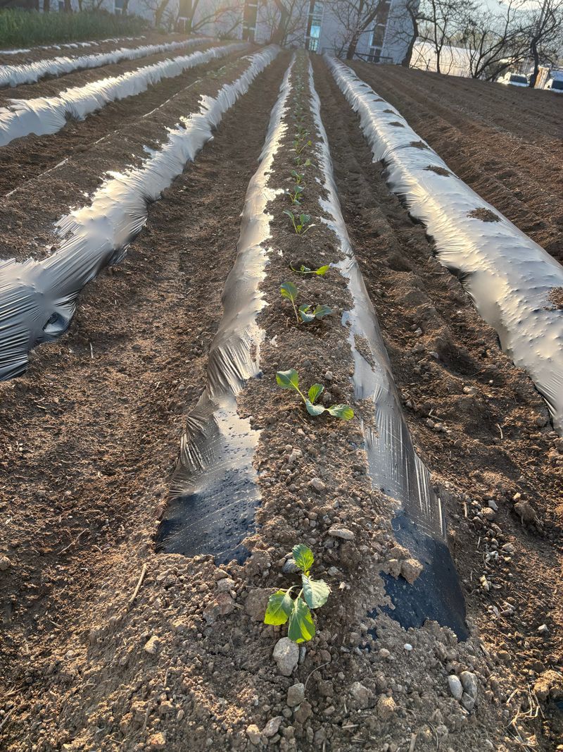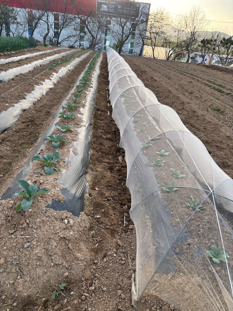 양재추. 반판 35포기 배추64포기 구입해서 정식( 미생믈 뿌리나라 요소 희석. 관주) 구멍에 물관주후 모종놓고 물관주 후. 흙덮기 봄배추 57포기 정식 터널설치후 부직포 덮음 고추 예정지. 미생물400L 분사 양배추. 배추 살충제. 살포