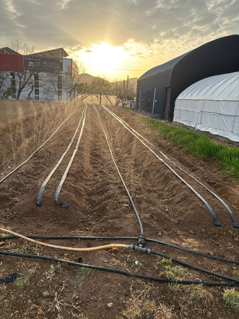 고추밭. 이랑 비닐 멀칭 완료 파구 61+60= 121개.바사코드. 6g 넣고. 흙넣기. 완료 터널준비. 활대 1미터간격. 곷고.간운데 1줄 띄우기 옥수수 예정지. 복합비료10kg 마샬 토양살충제 1.5kg 뿌리고 로타리. 후 미생물 설탕500g 희석. 분사