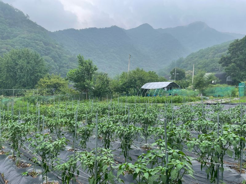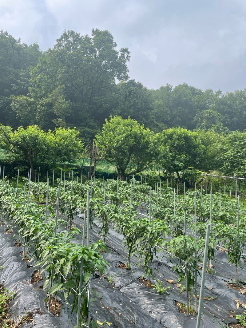 홍고추 한 판 심었습니다. 우리 먹기에 한 판도 충분했어요. 지금까지 추비 한 번 줬고 방제를 두 번 했습니다.