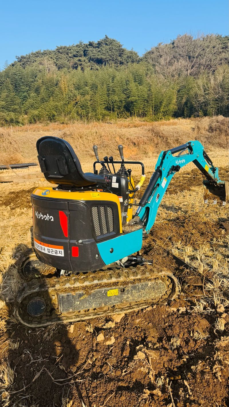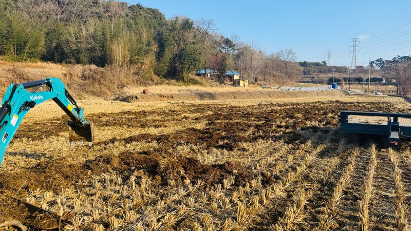 논에 염소퇴비 펼쳐주기, 논 배수로 굴삭기 작업, 논 관수호수 땅속으로 묻어 주기