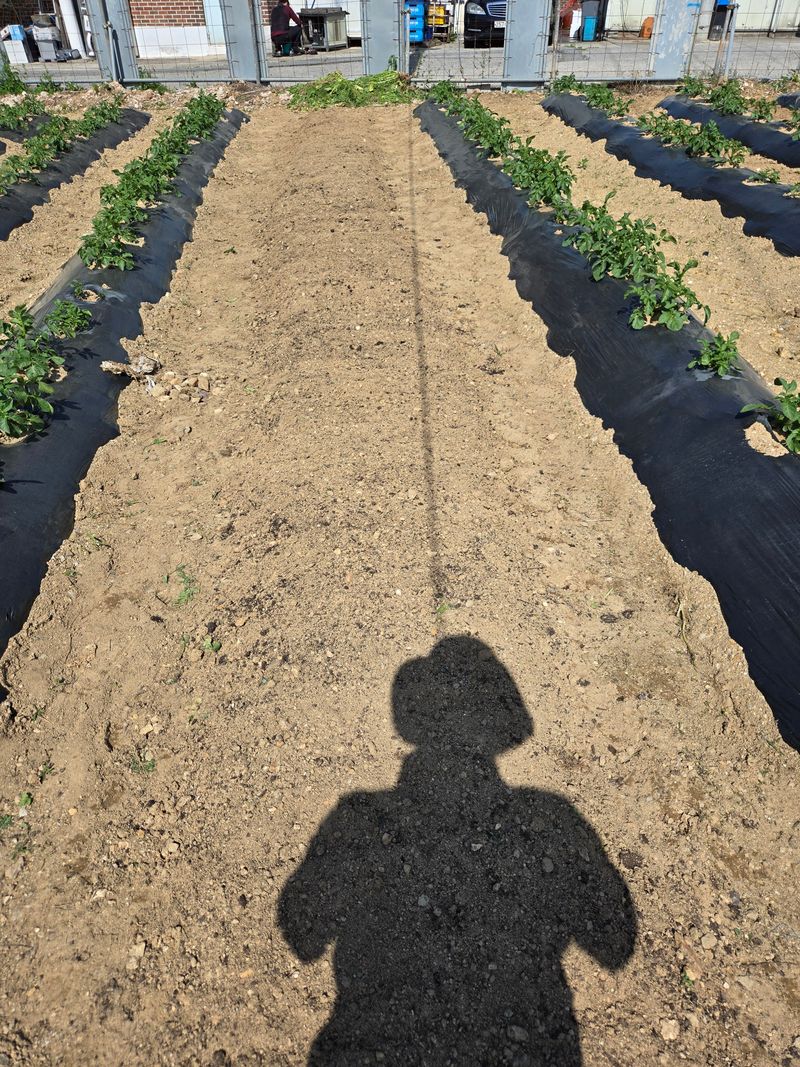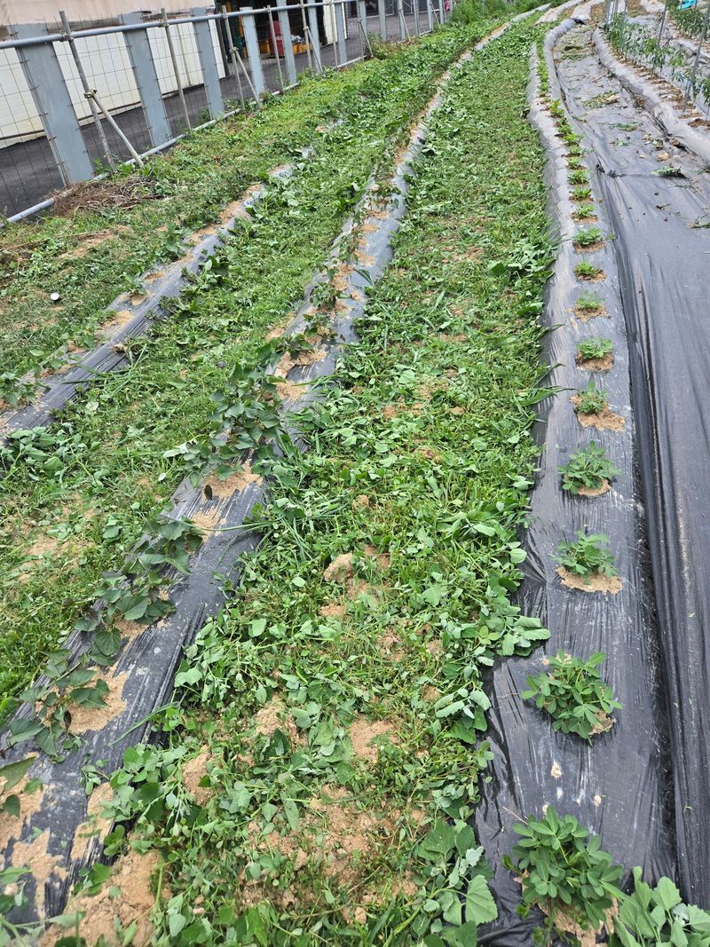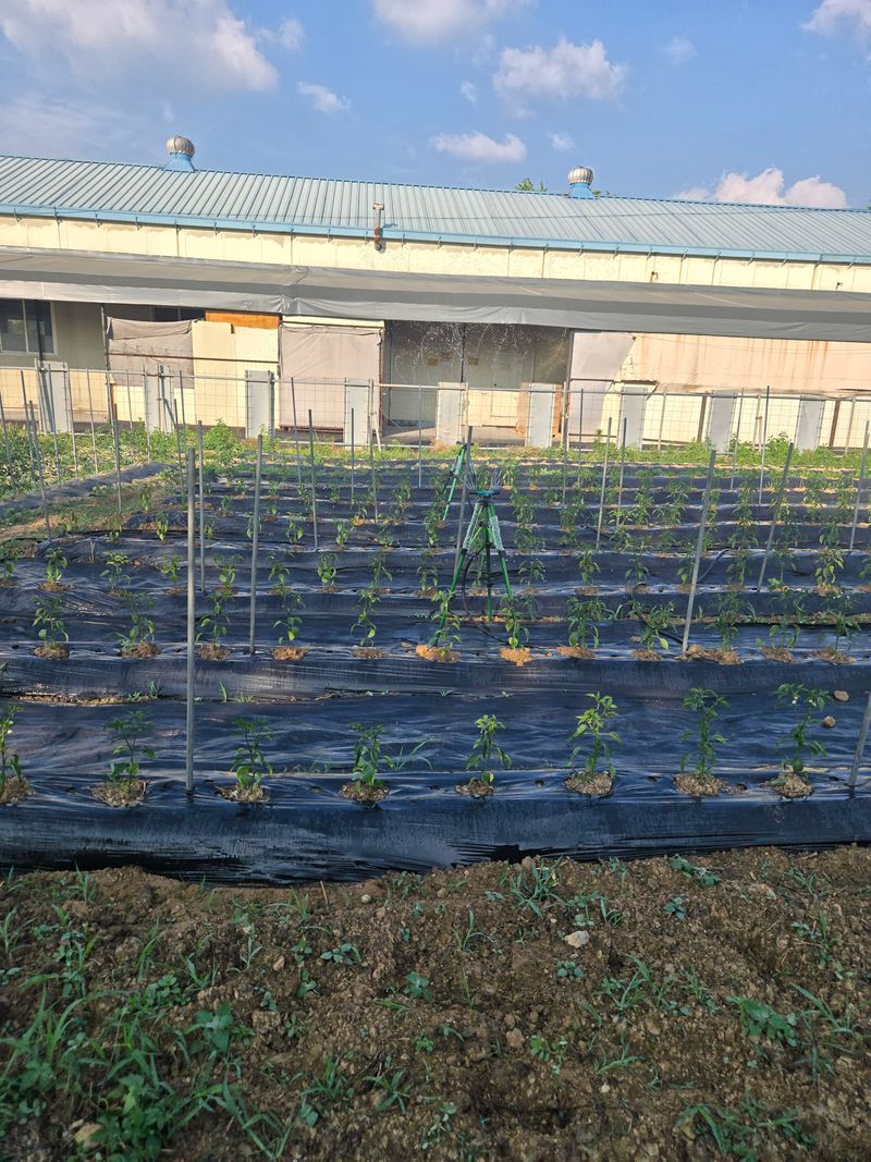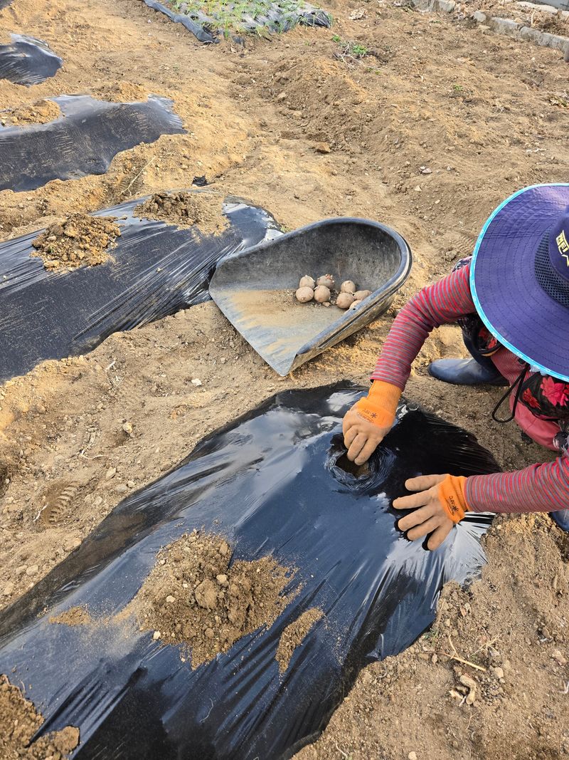 고추받. 제초메트. 깔는작업하고 고 대 박기작업하고 옥수수 100개심었어요 감자밭 순처주는작업했어요