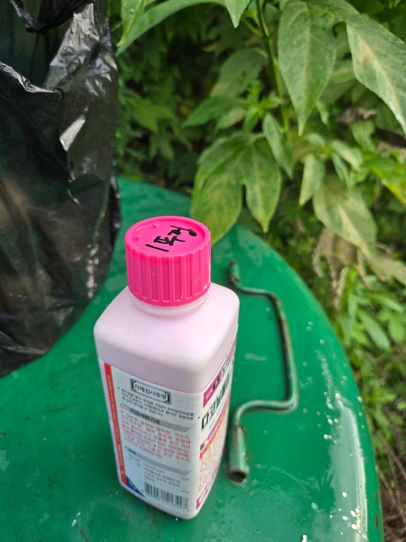오늘은고추밭에 농약 주었구요 고추를늣개심어서 키가않커서이제 2단줄메주는작업하였구요 참께밭 들께밭 자장자리예조기로 풀제거하고 제초제주었어요