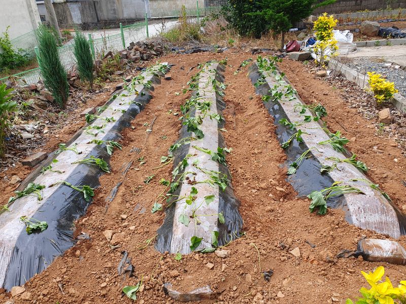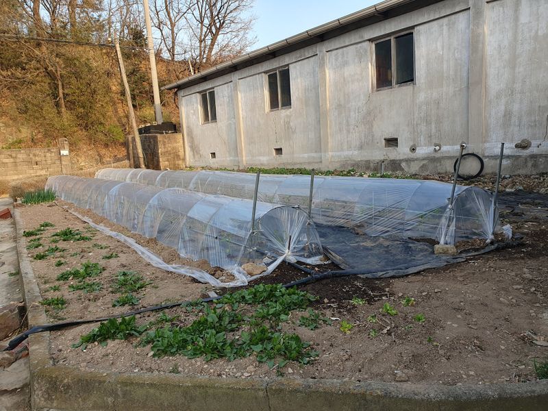텃밭에 고추심었습니다 물주기 편하게 분사호수도 깔고 풀 안나게 부직포도 깔았습니다 고추농사 잘 되길 바라는 마음 간절합니다^^