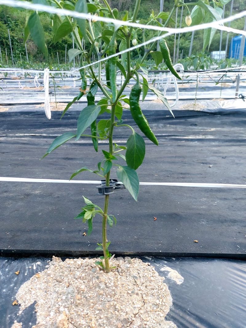 고추망 설치 저희는 고추줄을 이용하지않고 오미자망을 이용해서 고추묘목지지를 합니다 물론공정과 자재는 추가되지만 고추목자체는 스트레스는 덜하고 고추가 굻고 마니 열리네요