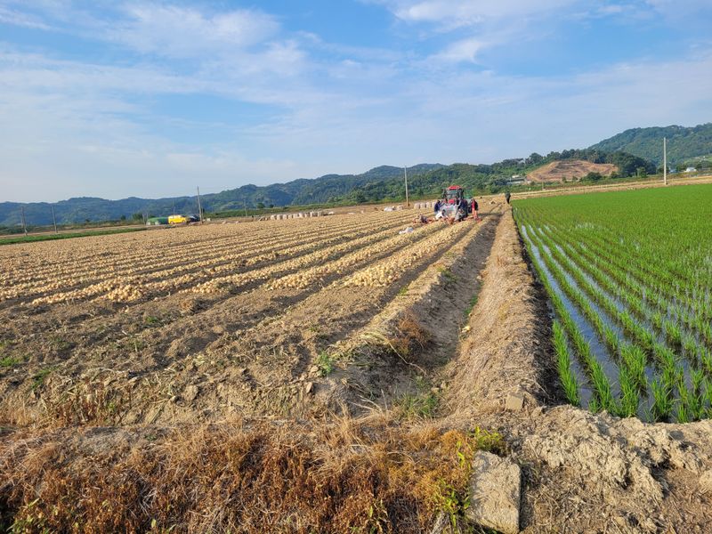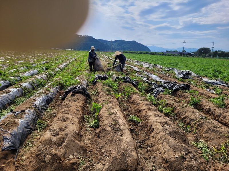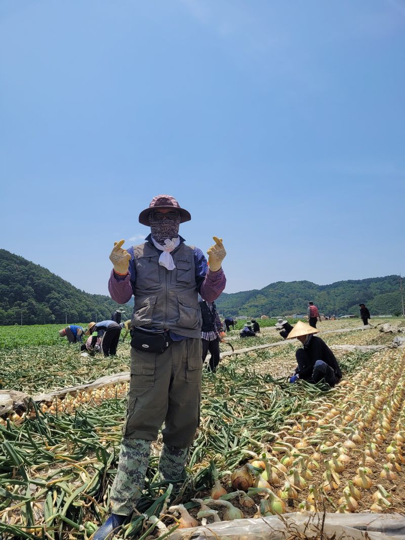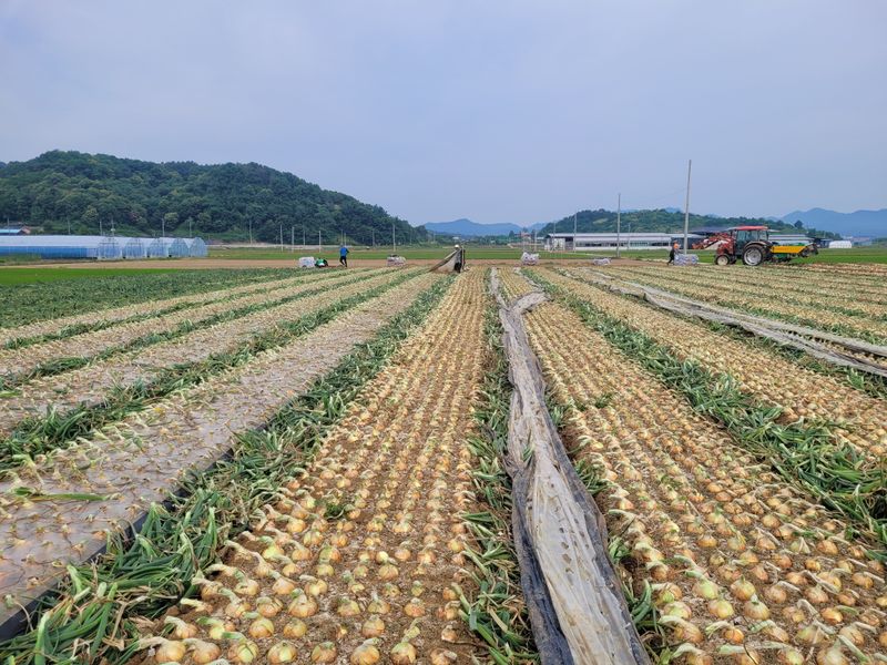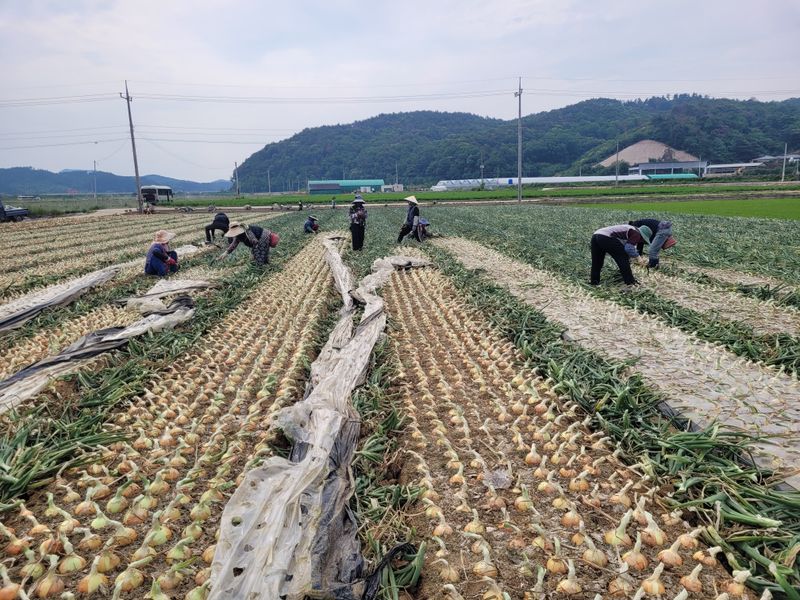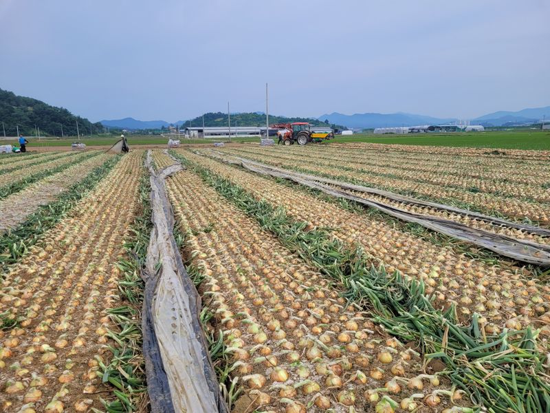 농민 여러분 정말 양파작업 더위에 너무너무 힘드네요 다들 좋은결실 맺어시고 건강유의 하세요 오늘도 매재 양파밭에 작업했습니다