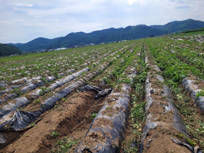 감자밭에 멀칭비닐 구멍으로 싹올리기 작업