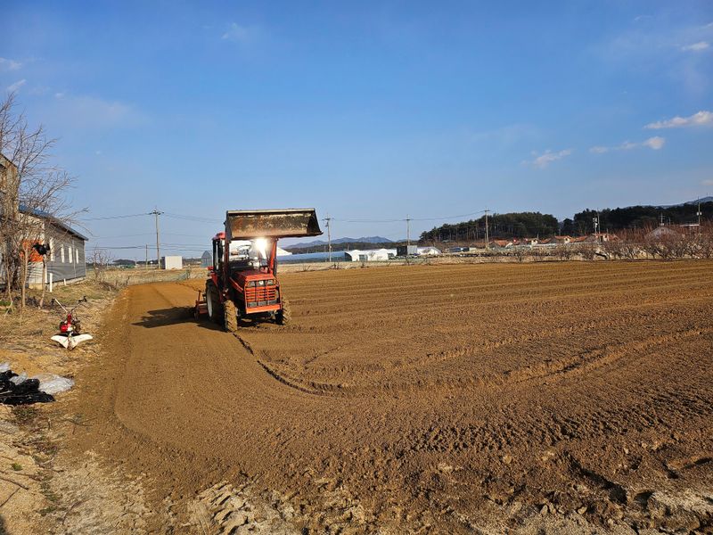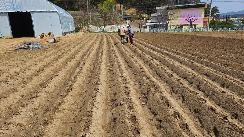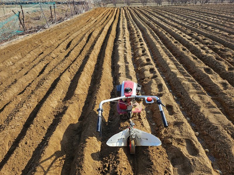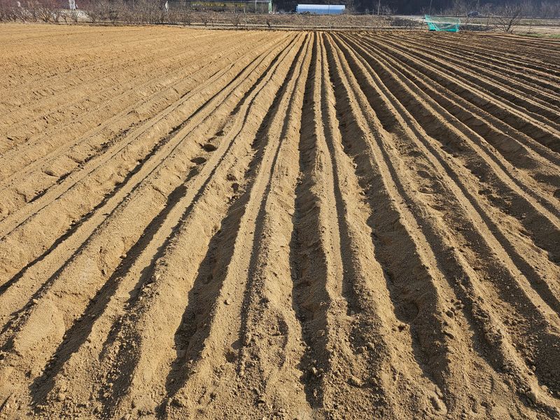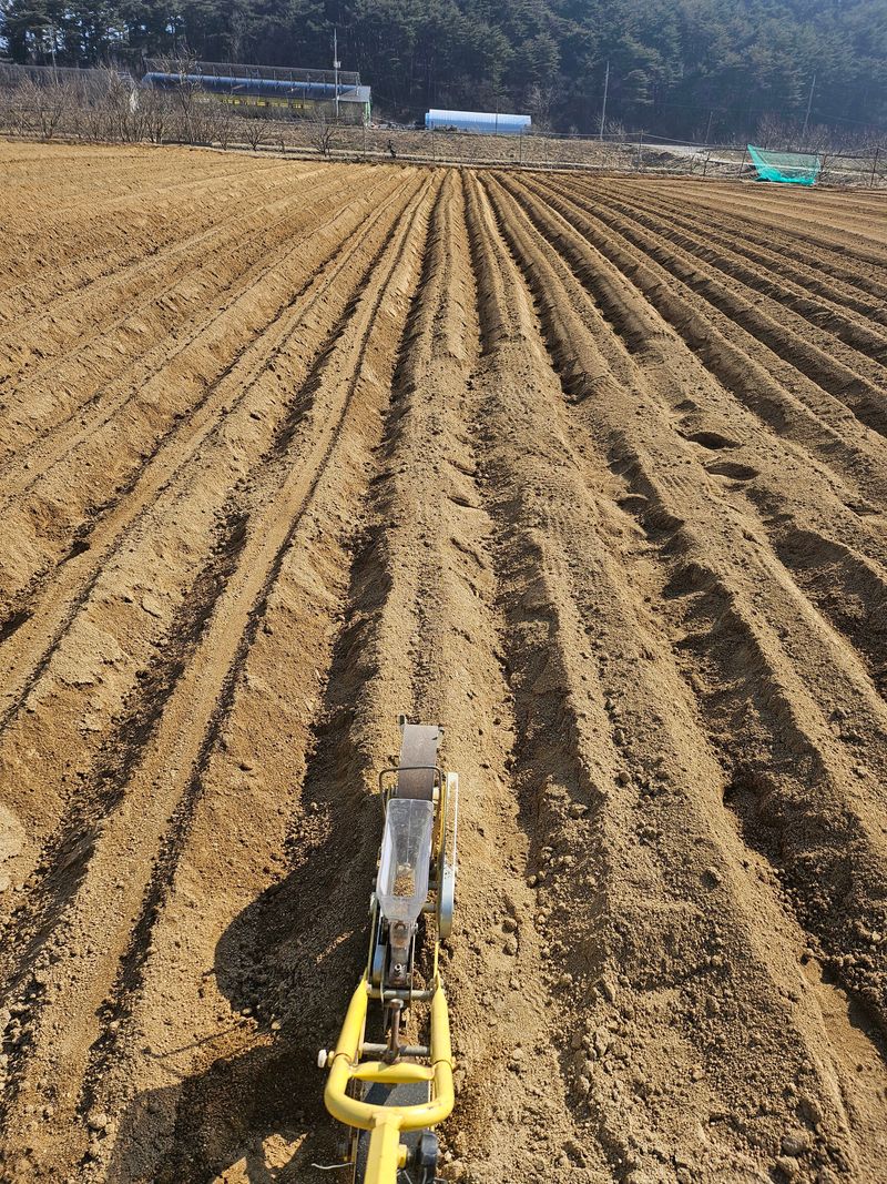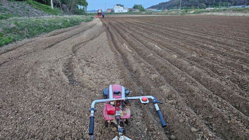감자 파종 준비하기 감자비료, 토양살충제, 유박 거름 살포후 로타리와 이랑 만들기 했습니다..