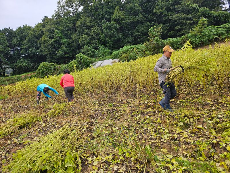 비가 계속 와서 들깨를 못 베었었는데 오늘은 잠깐 비가 안오길래 들깨 베었어요. 하우스안에다 모두 세워 놓았어요