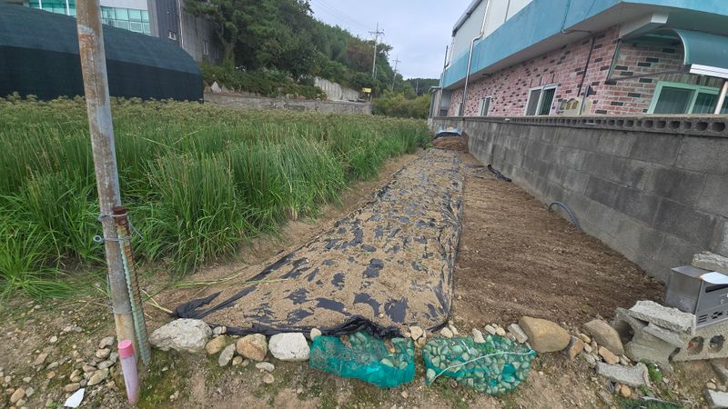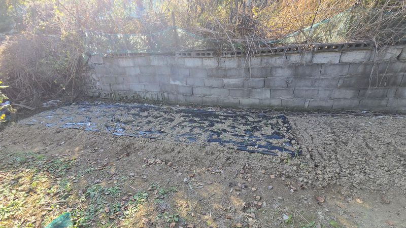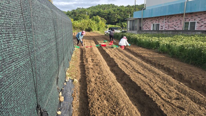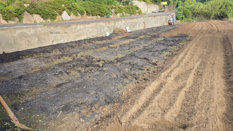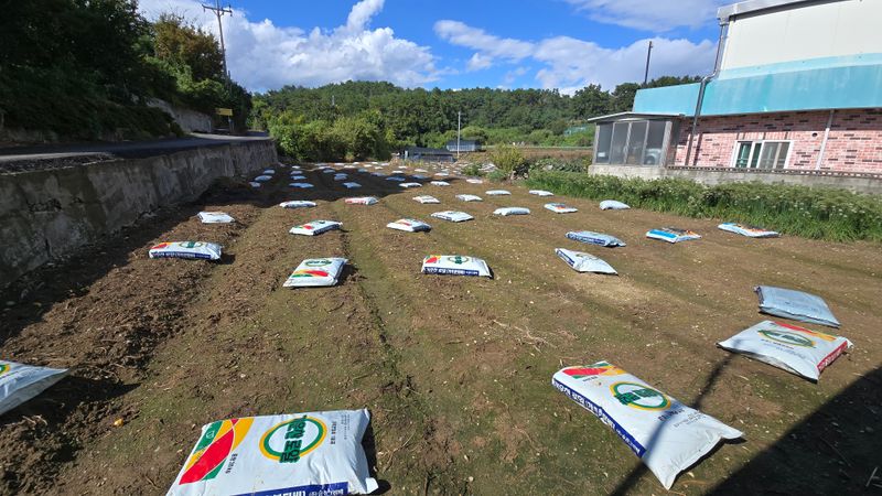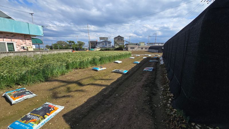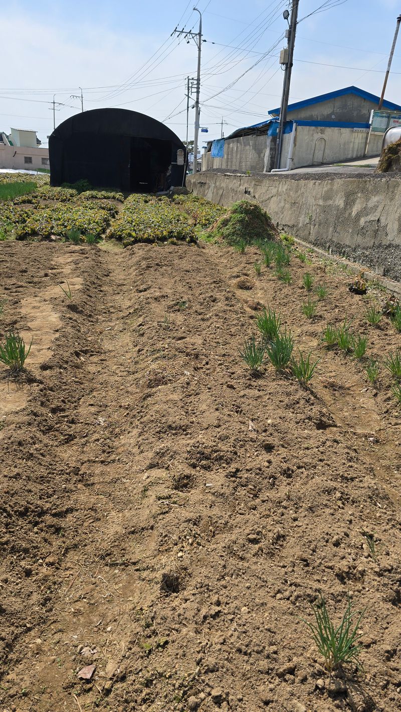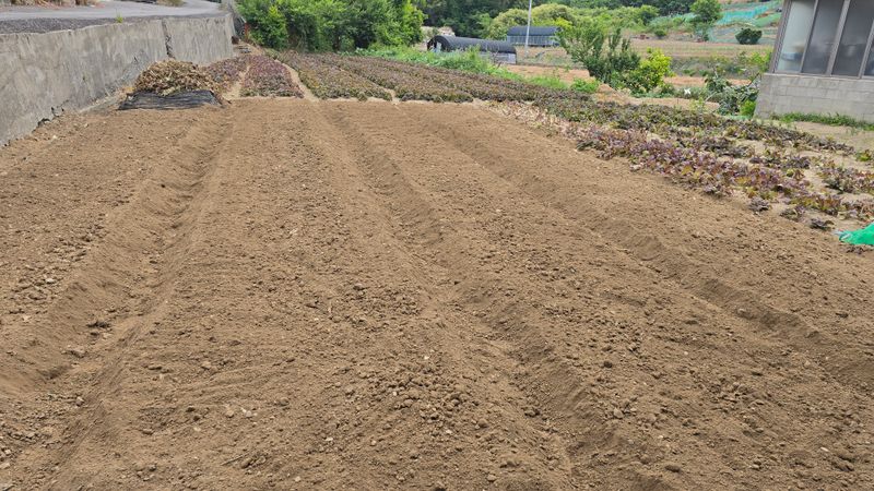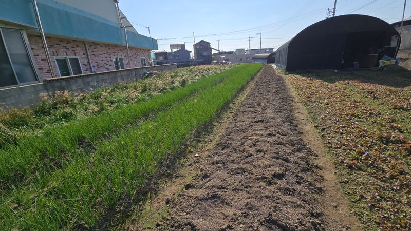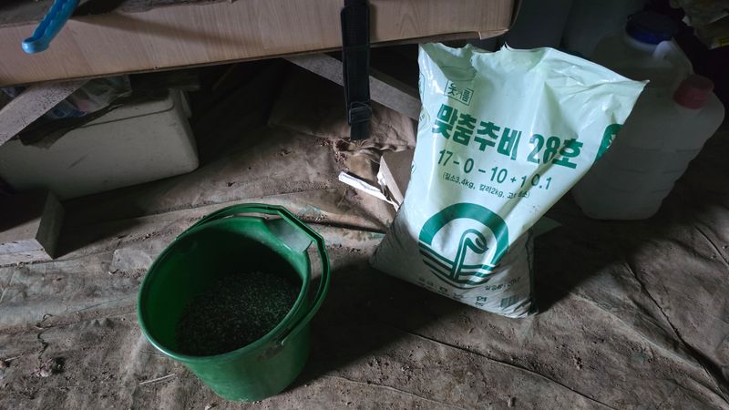 마늘 1고랑 파종 준비. 퇴비 2포 및 밑비료 앚춤18호 살포 후 경운