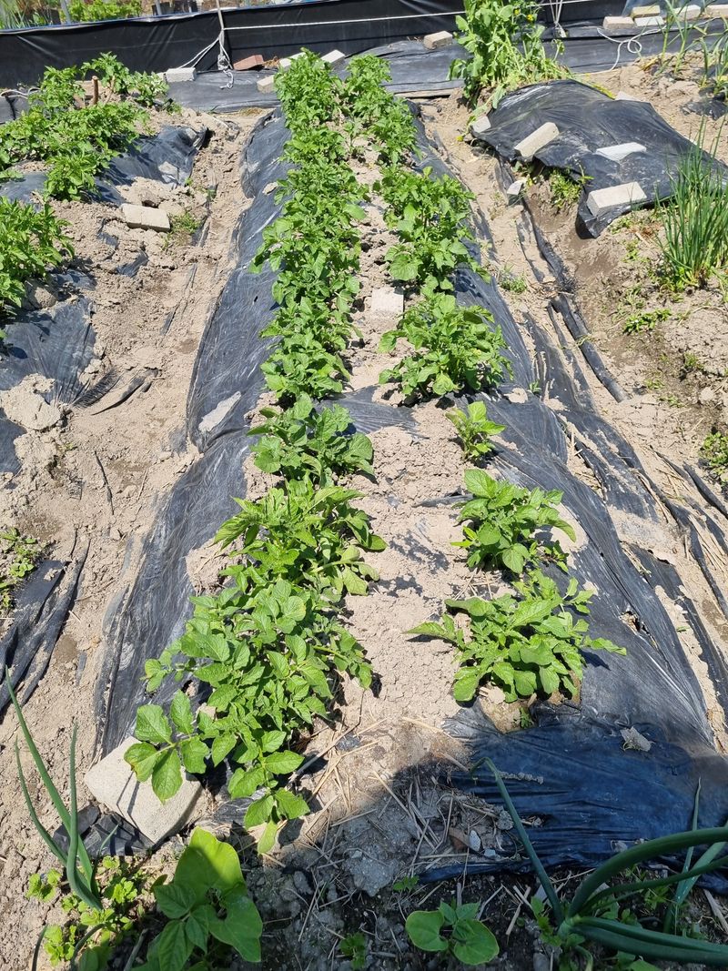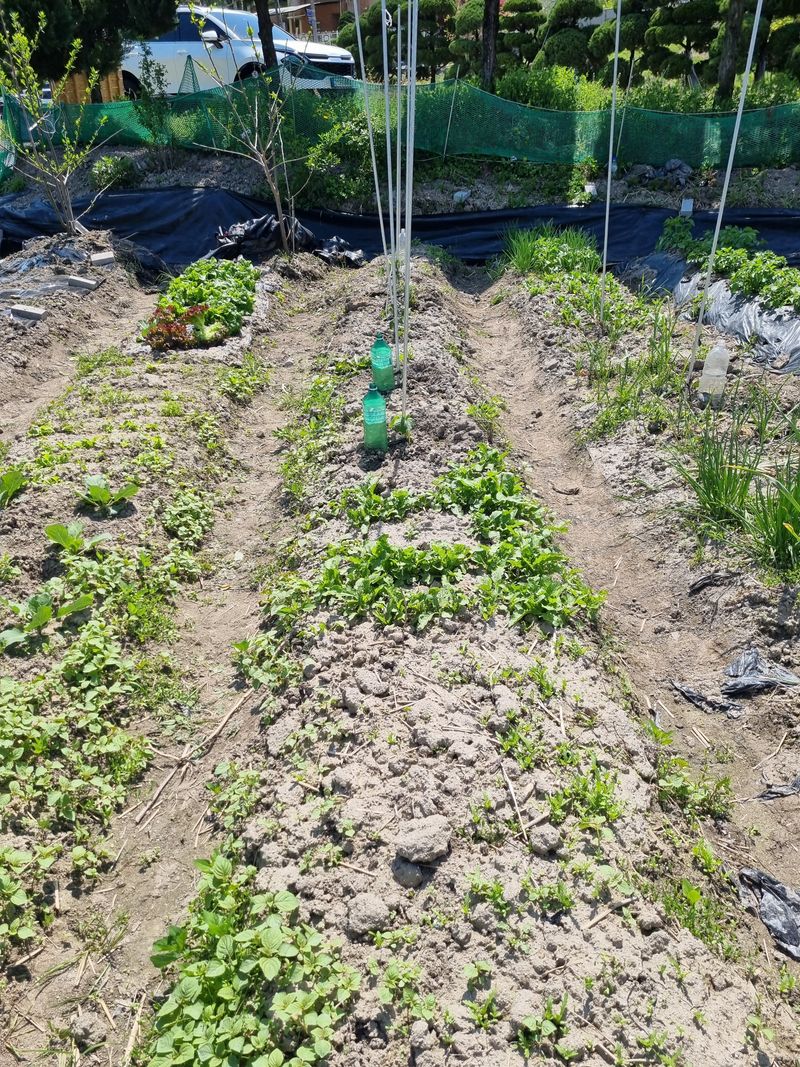 감자 북주고 사과꽃 따고 옥수수 심고 완두콩 지주대 세우고. 상추.미나리.쑥갓.치커리 수확해서 지인들과 나눔하기