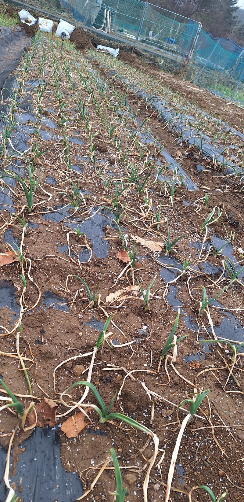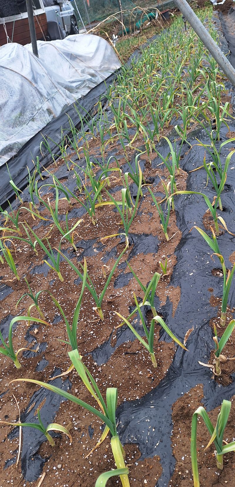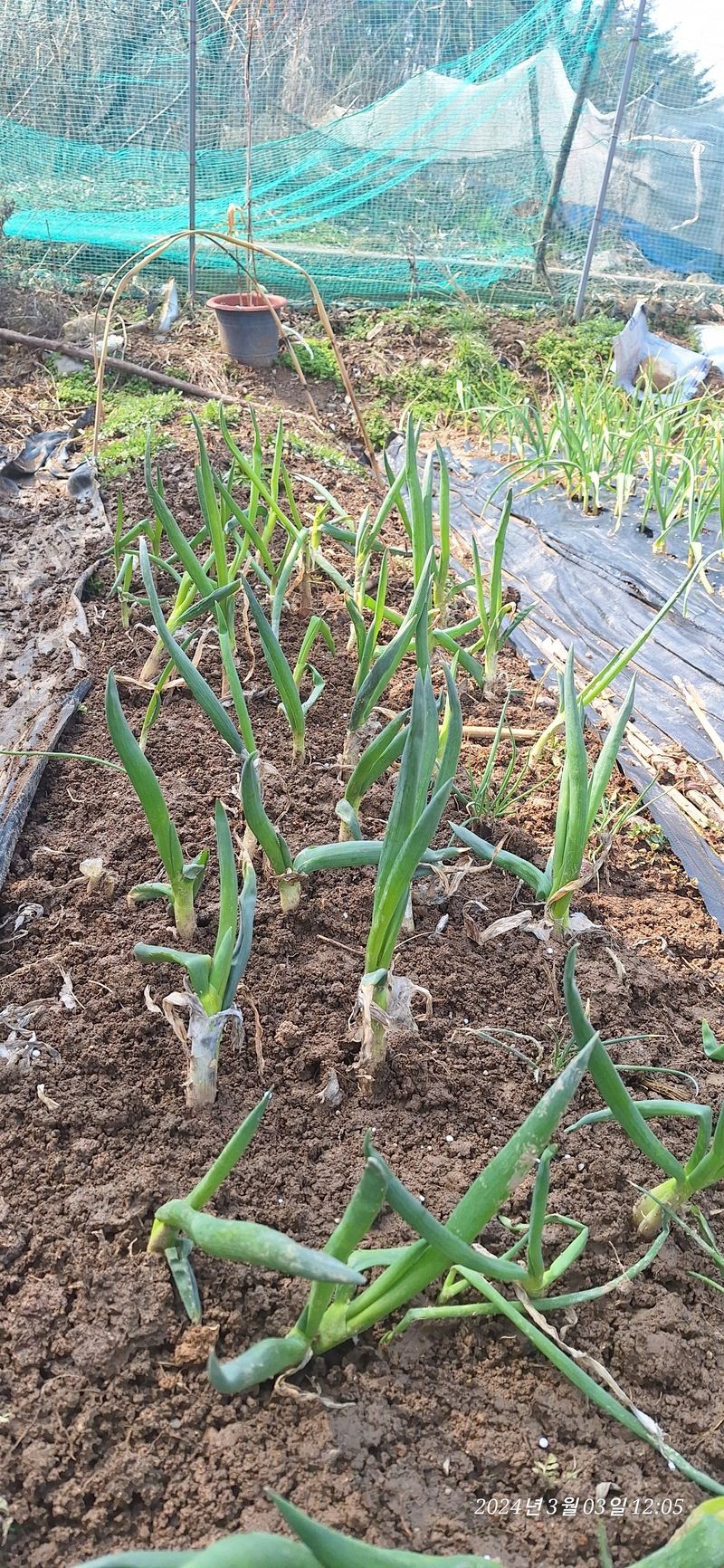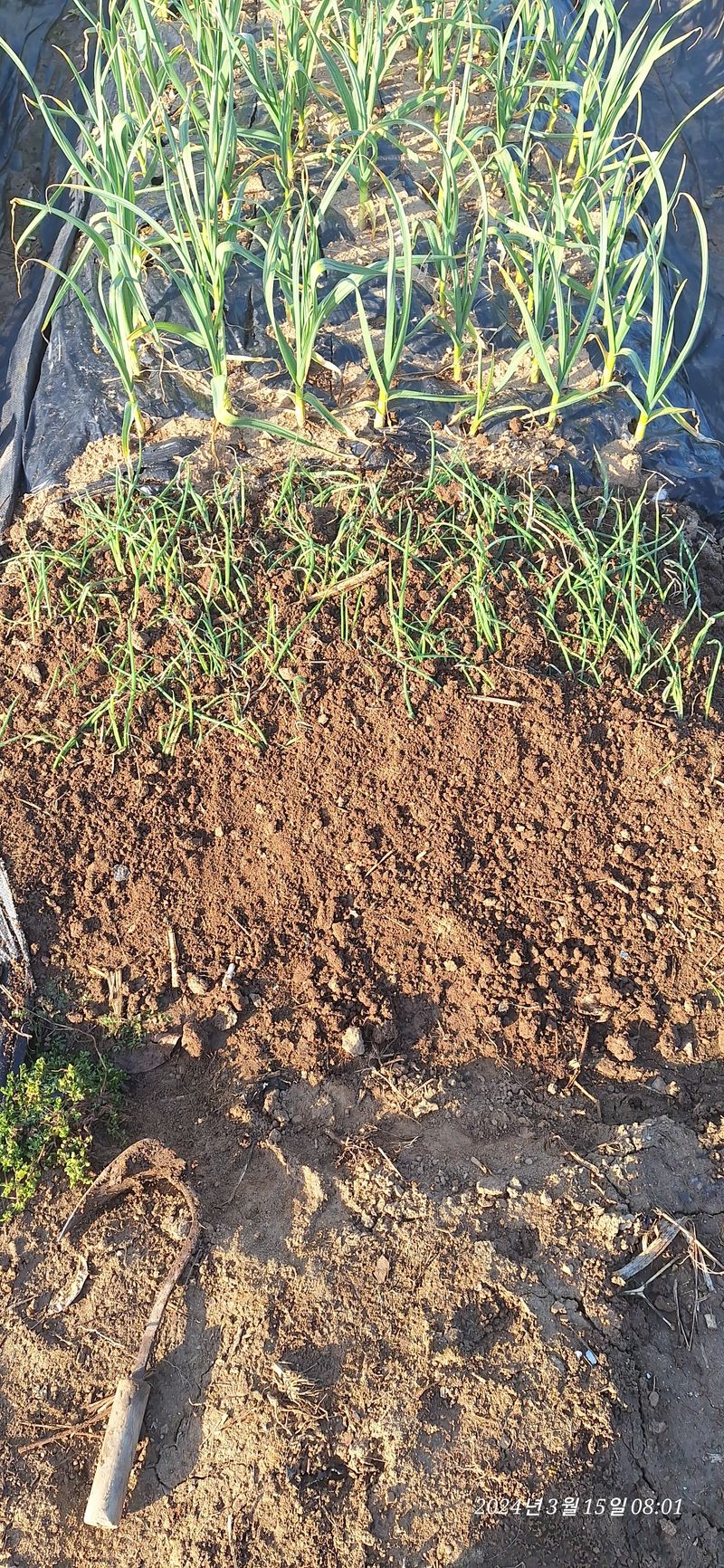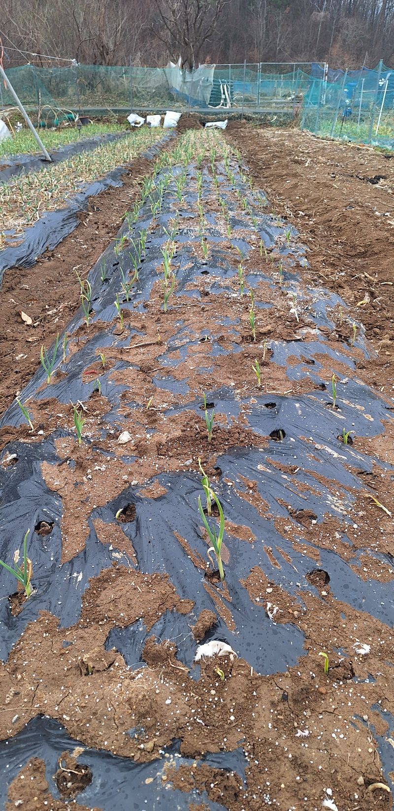 부직포 안 씌우고 겨울 난 난지형 마늘, 만생종 양파 1차 추비 뿌려줌 요소+복합비료 7:3비율 섞음 . 날씨 이슬비 내림