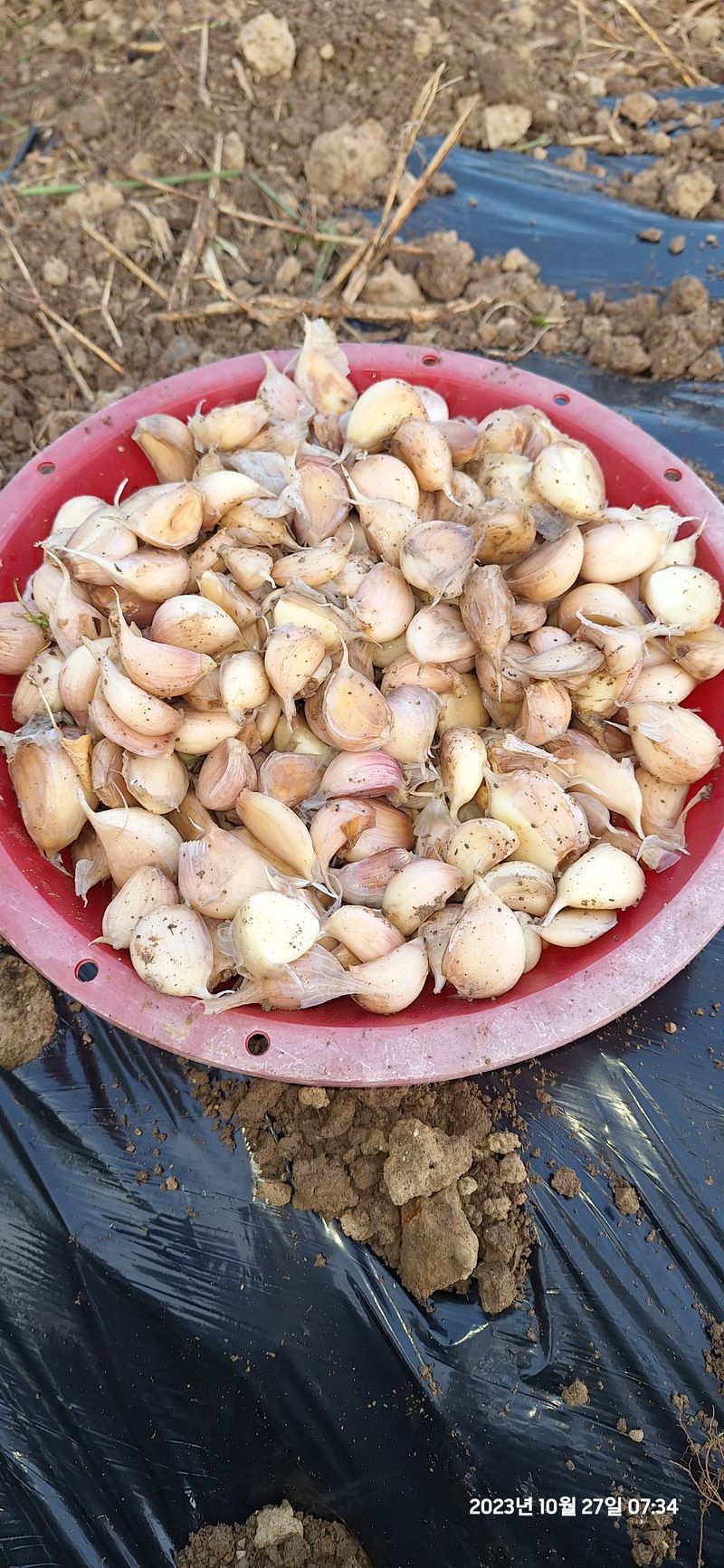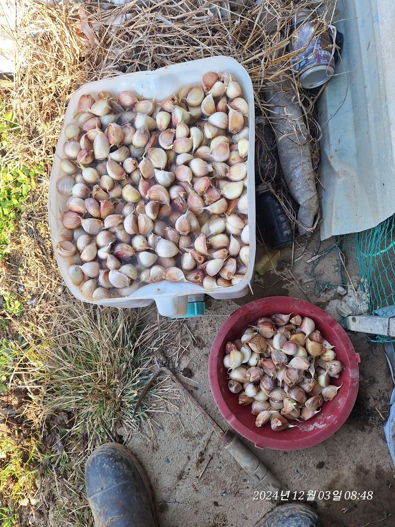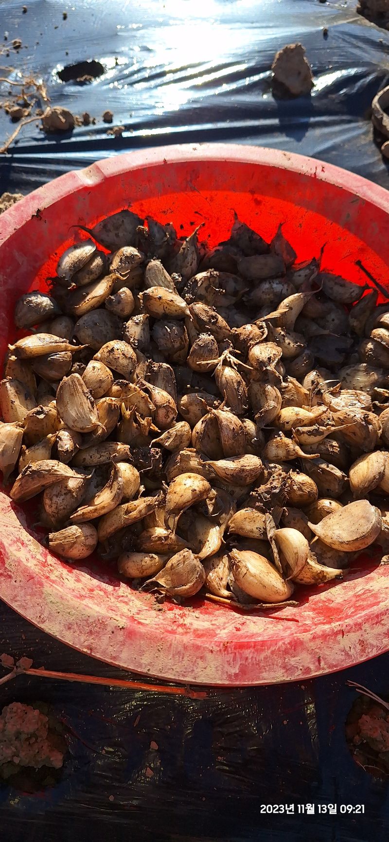 종자소독하고 씨알이 작아 빼둔 마늘 이랑 만들고 마저 심기. 첫 된서리 내림.잎 들깨 동해 입음