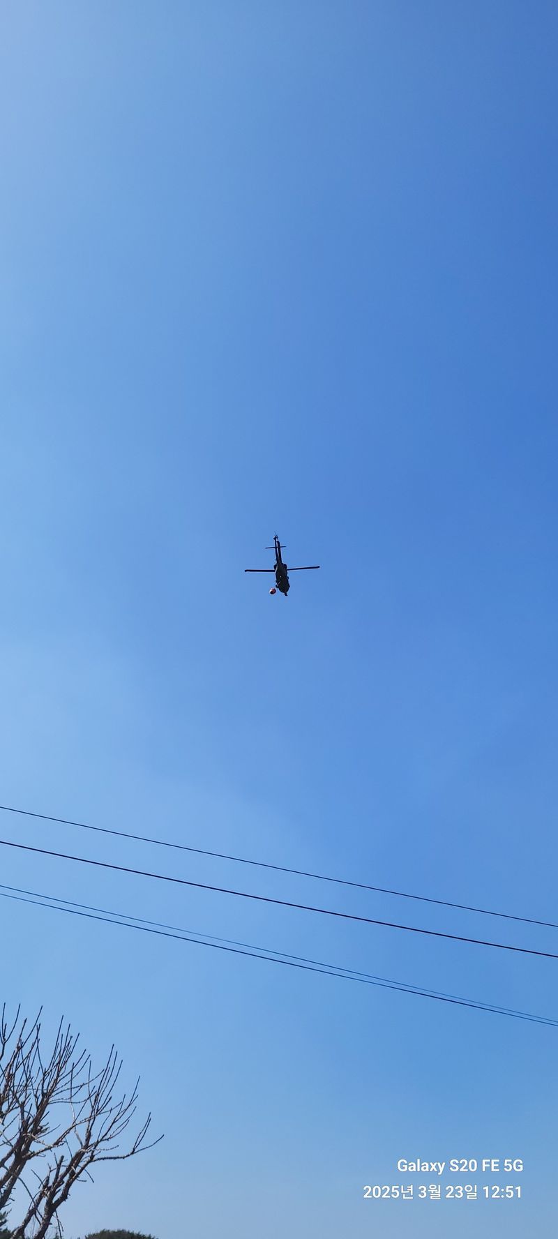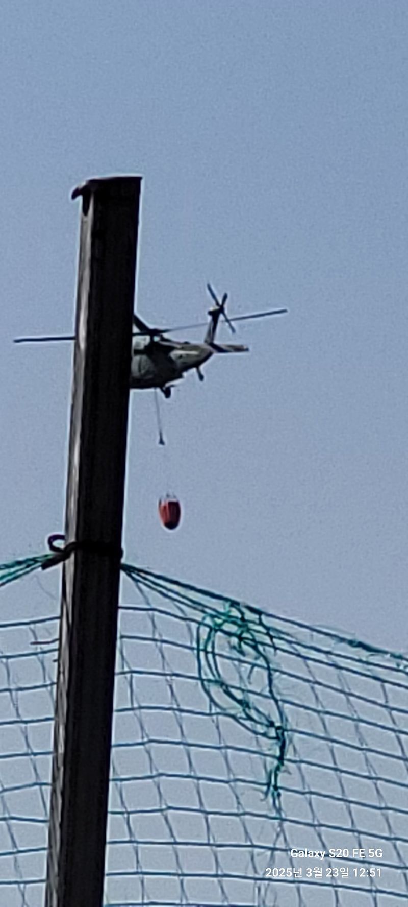 06시부터 산불진화 소방헬기 및 군용헬기 지원나옴. 16시 공무원들 나와 야간에 대피 및 마을회관에 모여 있으라는 안내방송에 부산 본가 내려옴