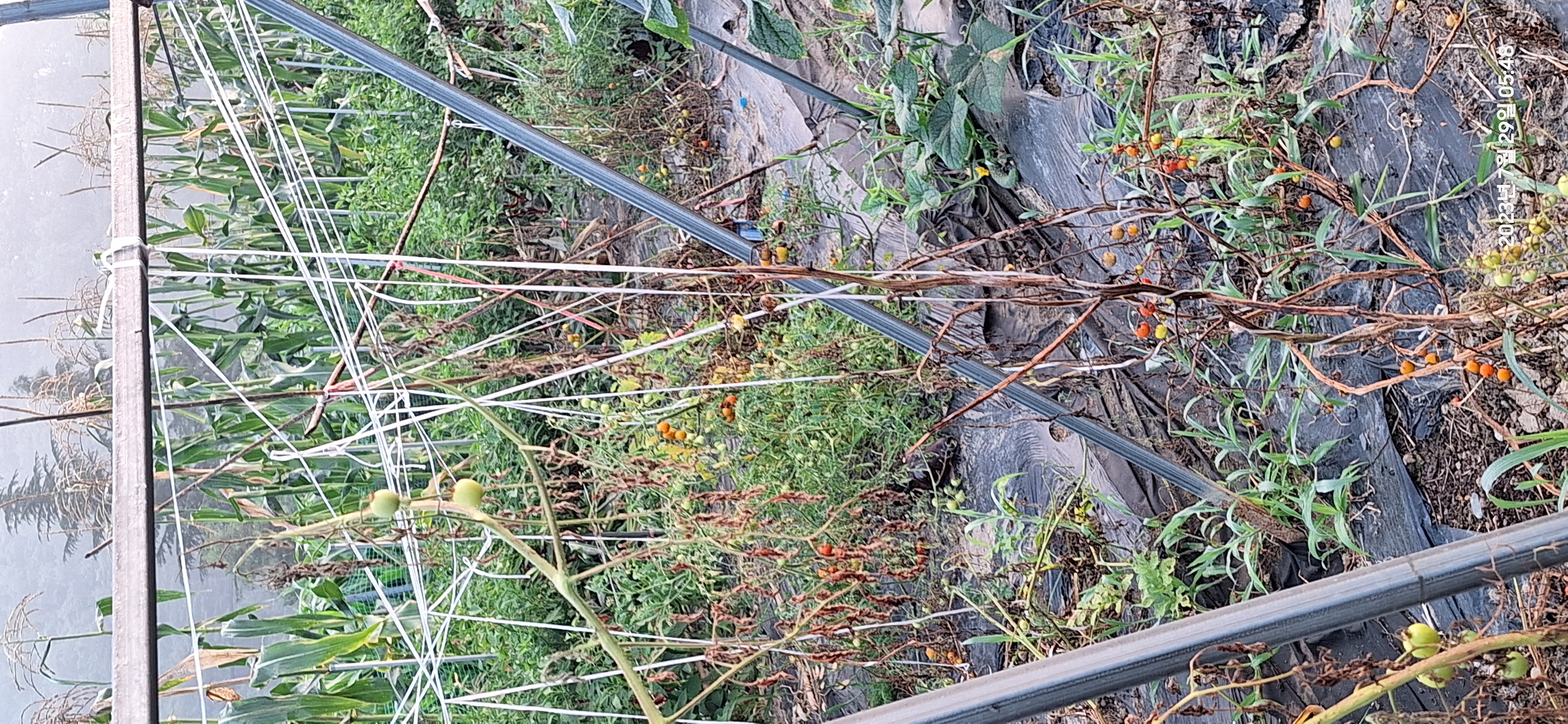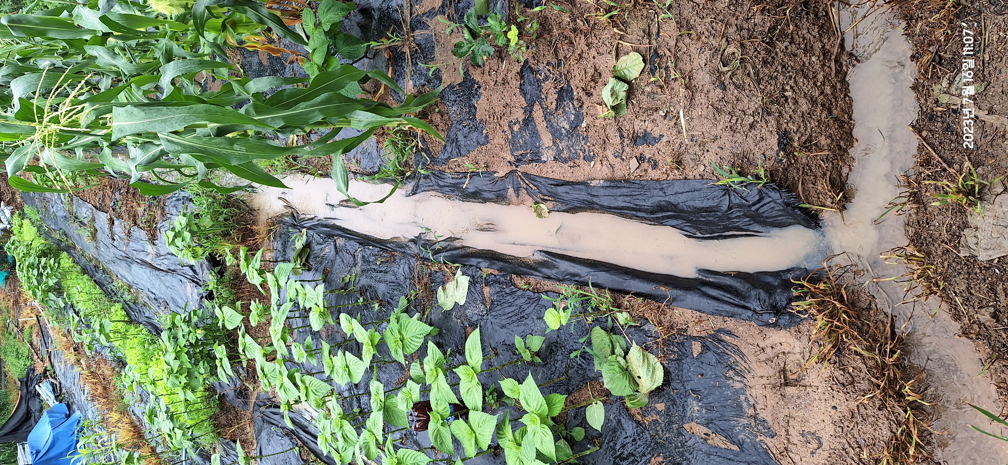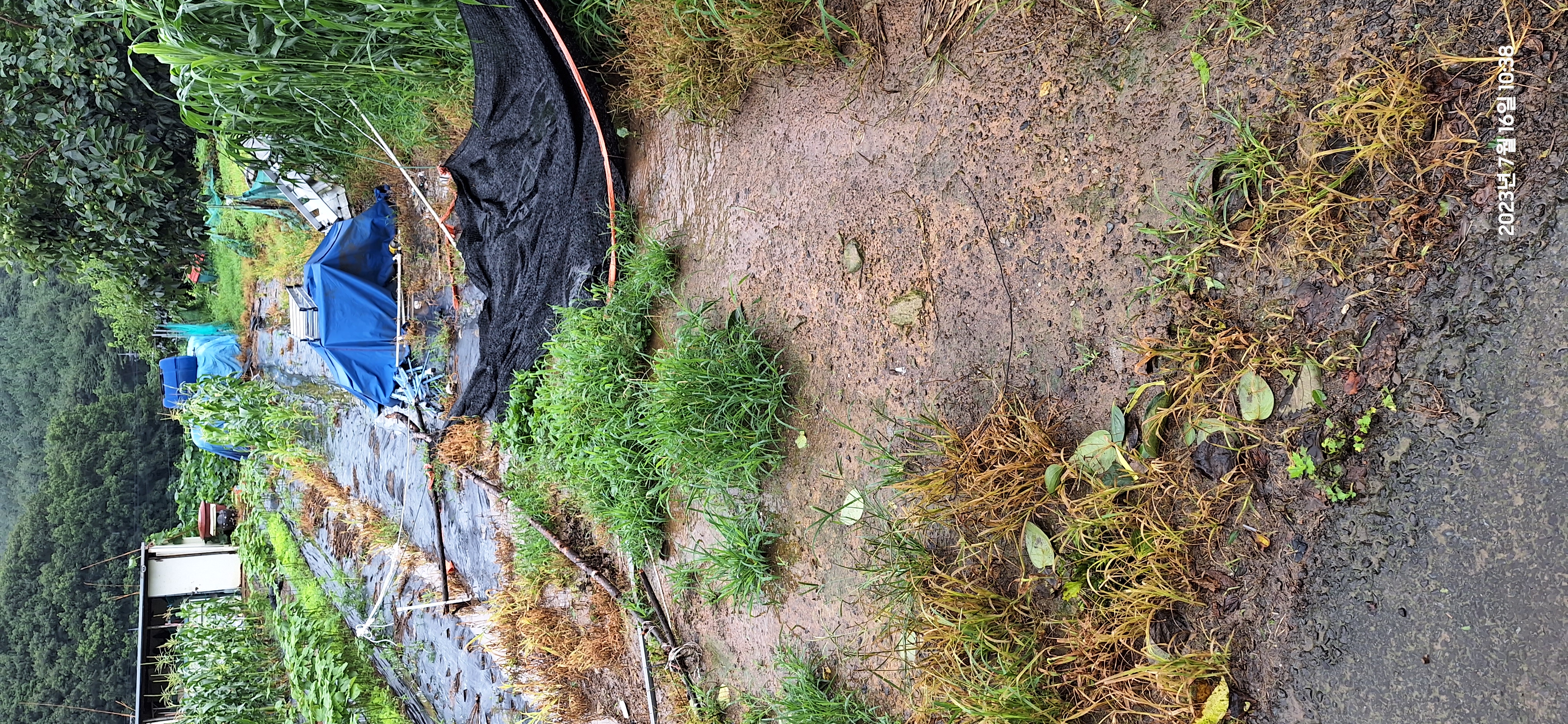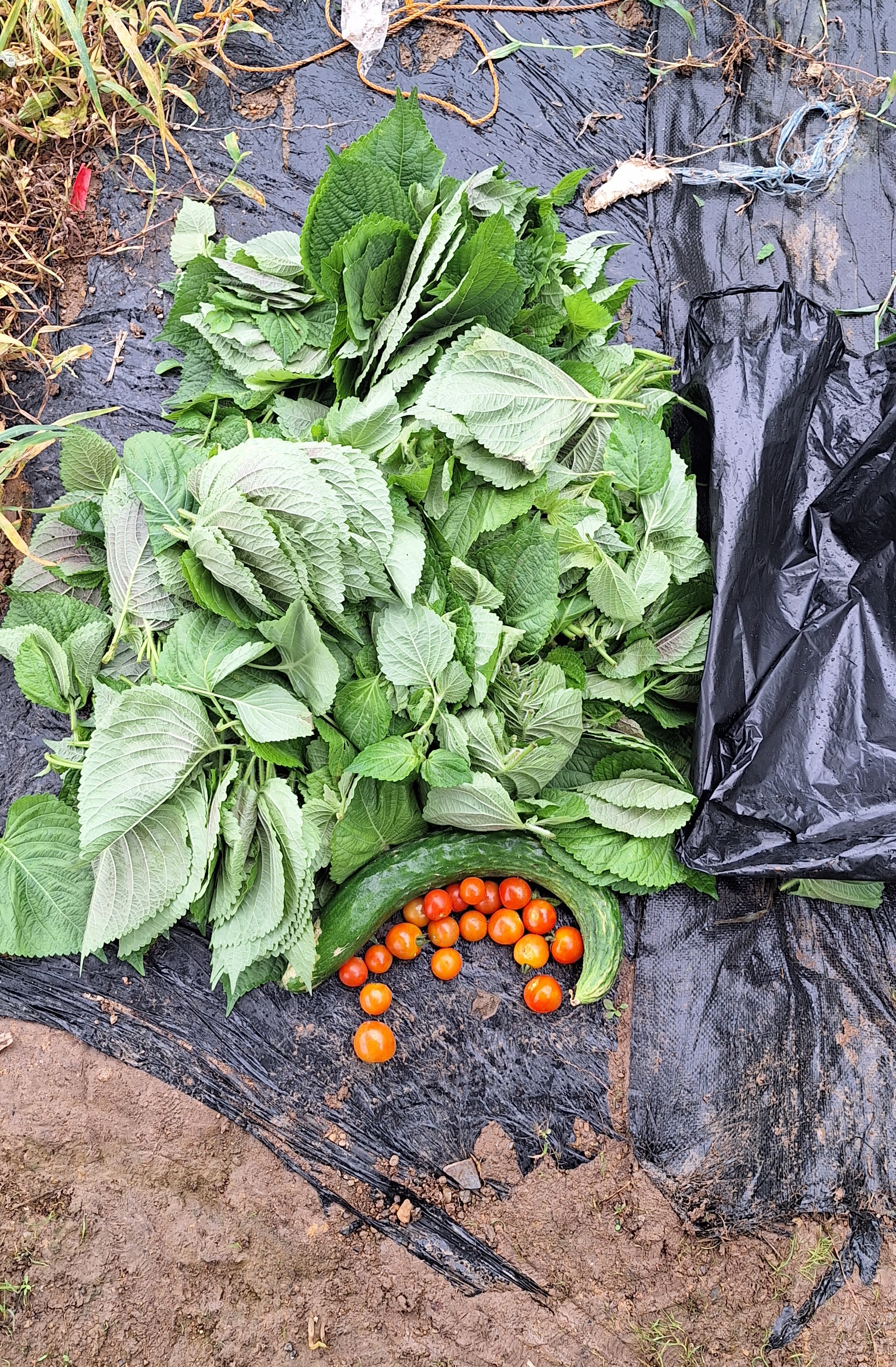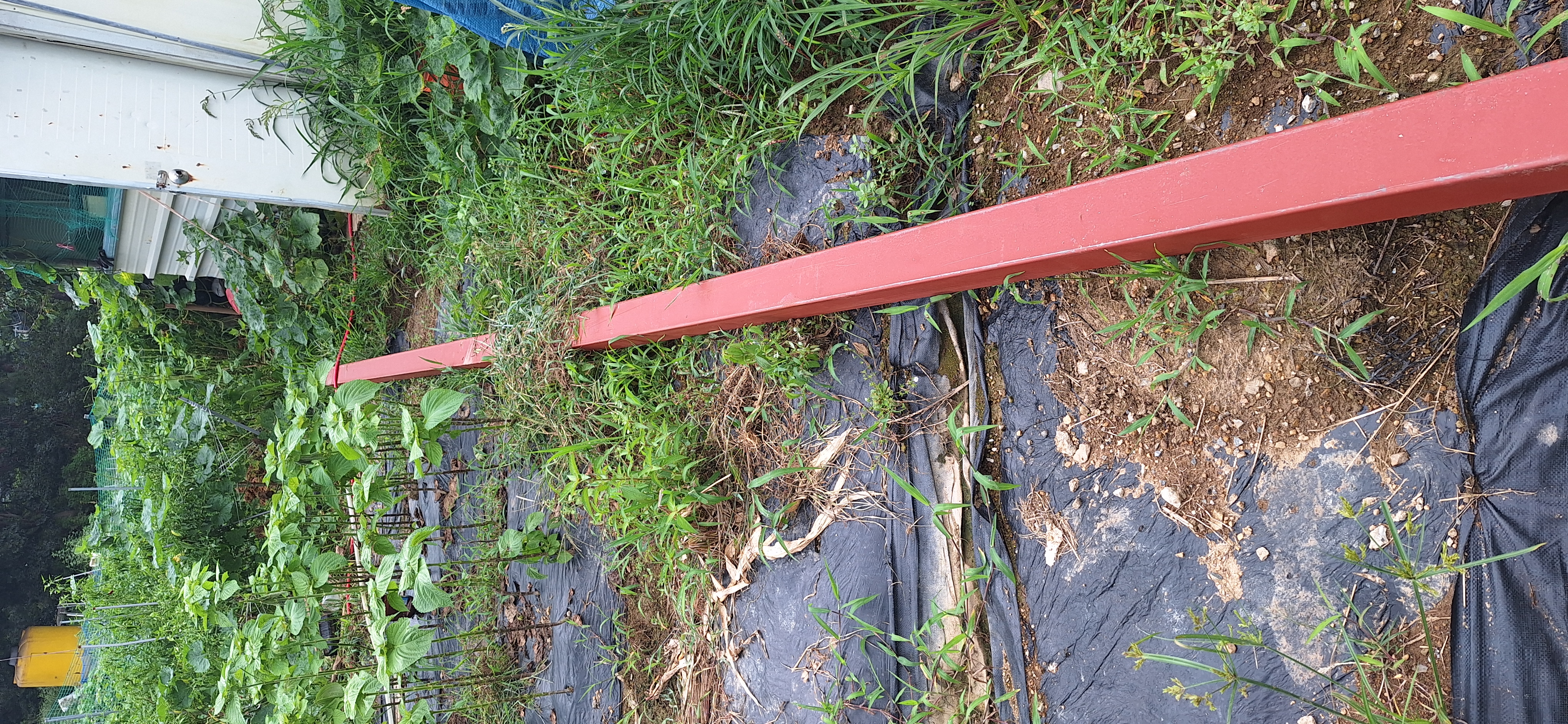 폭우와 바람으로 그늘망 무너짐. 배수로에 쌓인 흙 제거 및 방울토마토.오이 수확