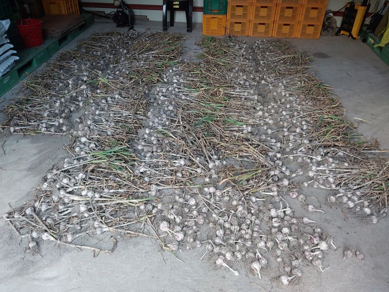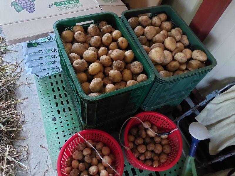 감자 4콘티 반. 마늘 15접 가량 수확. 샤인 나동 1차 알솎기.