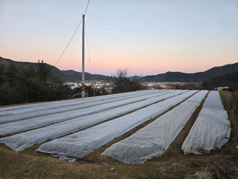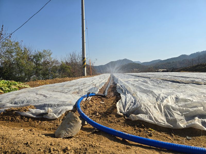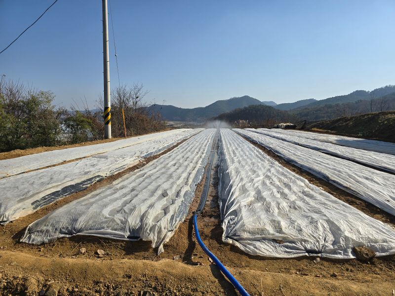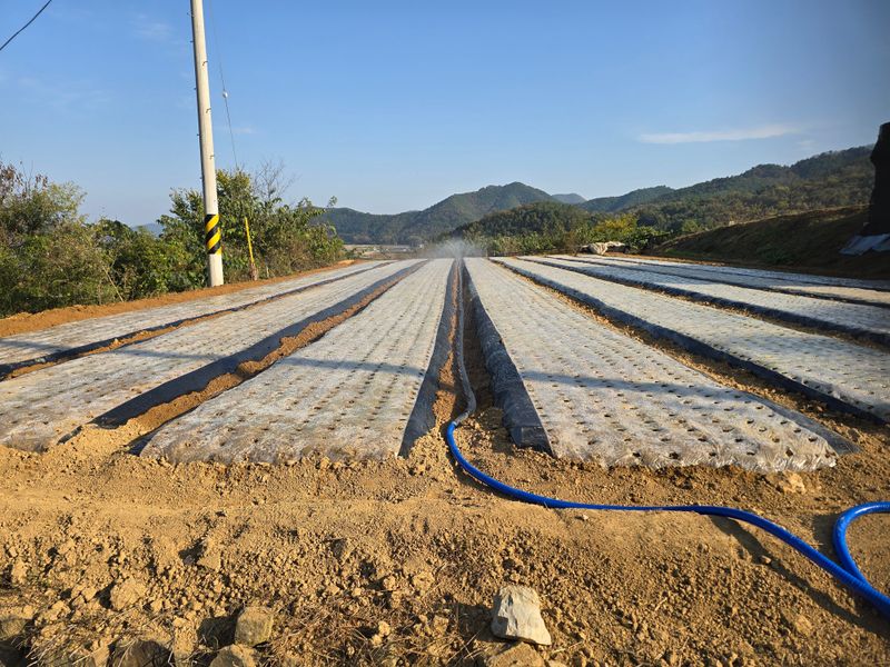 마늘밭 부직포덮고양수기물주기