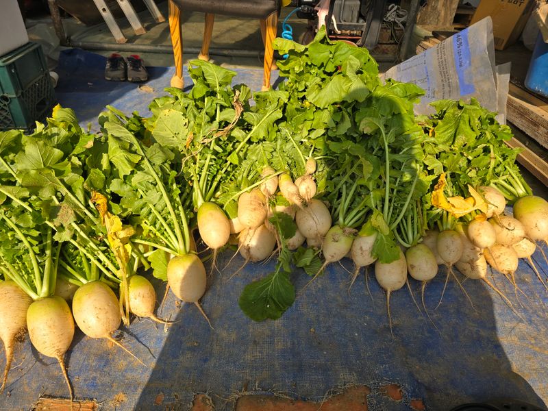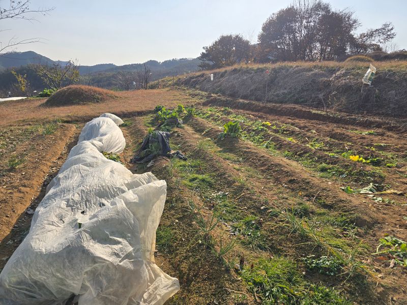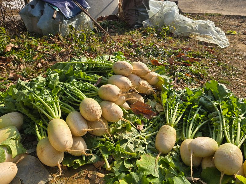 부직포덮은 무우수확했어요 크기가중간 싸이즈가되어 무우김치담아 늦겨울 숙성되면 맛있게?보이네요 배추는120포기중2포기남고 무름병걸려실패했어요