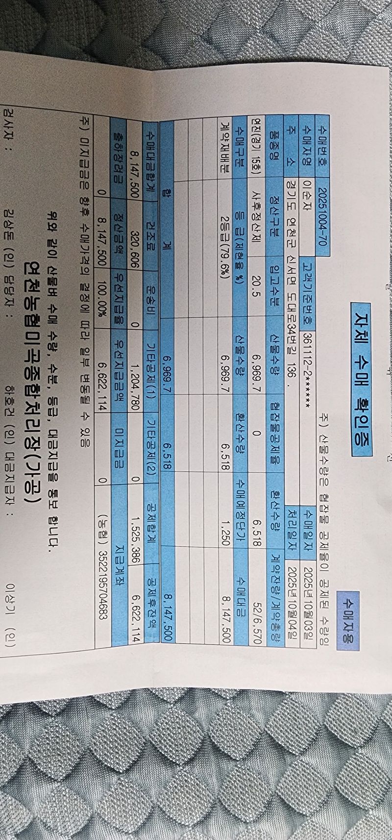 추수 모내기 133일 후 물수매 키로수 705kg