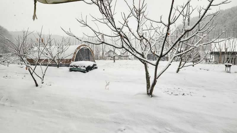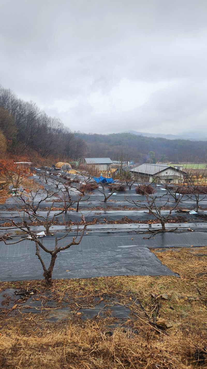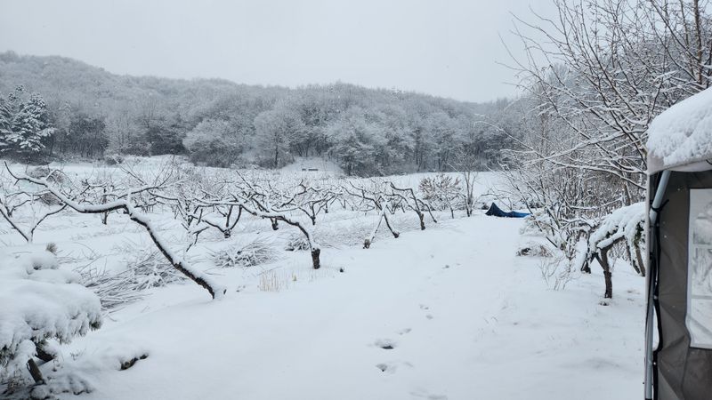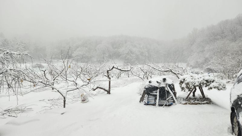 작년 겨울 복숭아나무 전지한것 정리 하려는데 밤새 눈이 오셨네요.