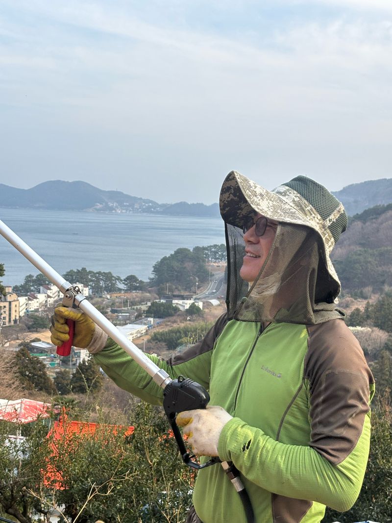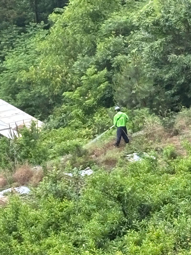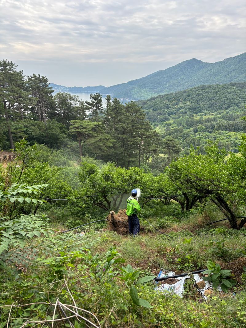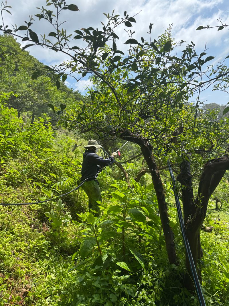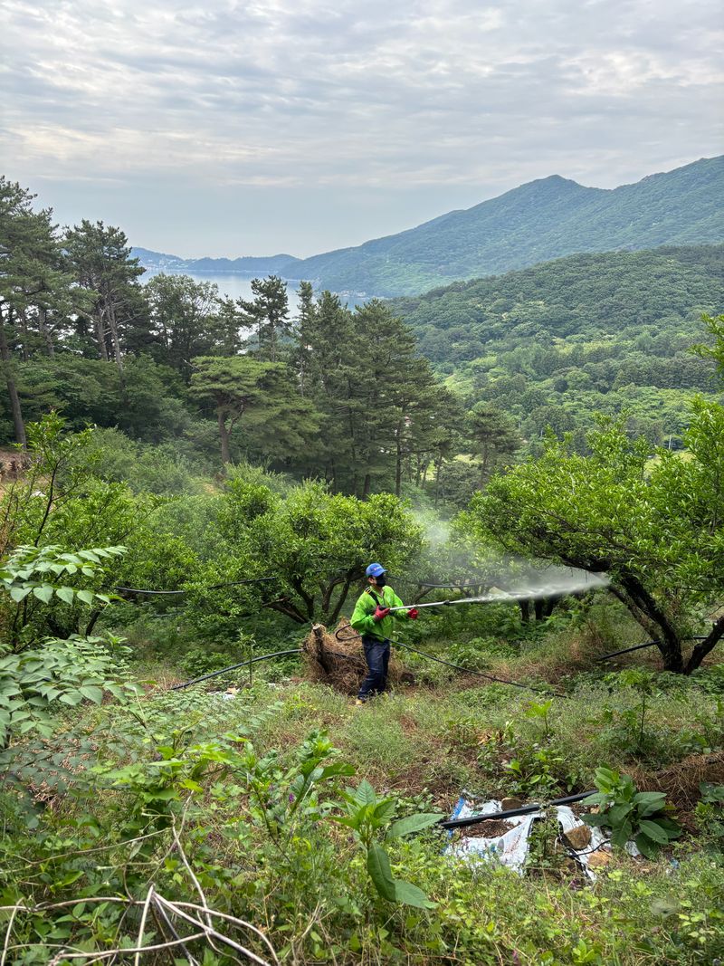 방제작업. 계단추가작업. 유황. 기계유제. 올해 첫 방제.꽃이 많이 졌음.