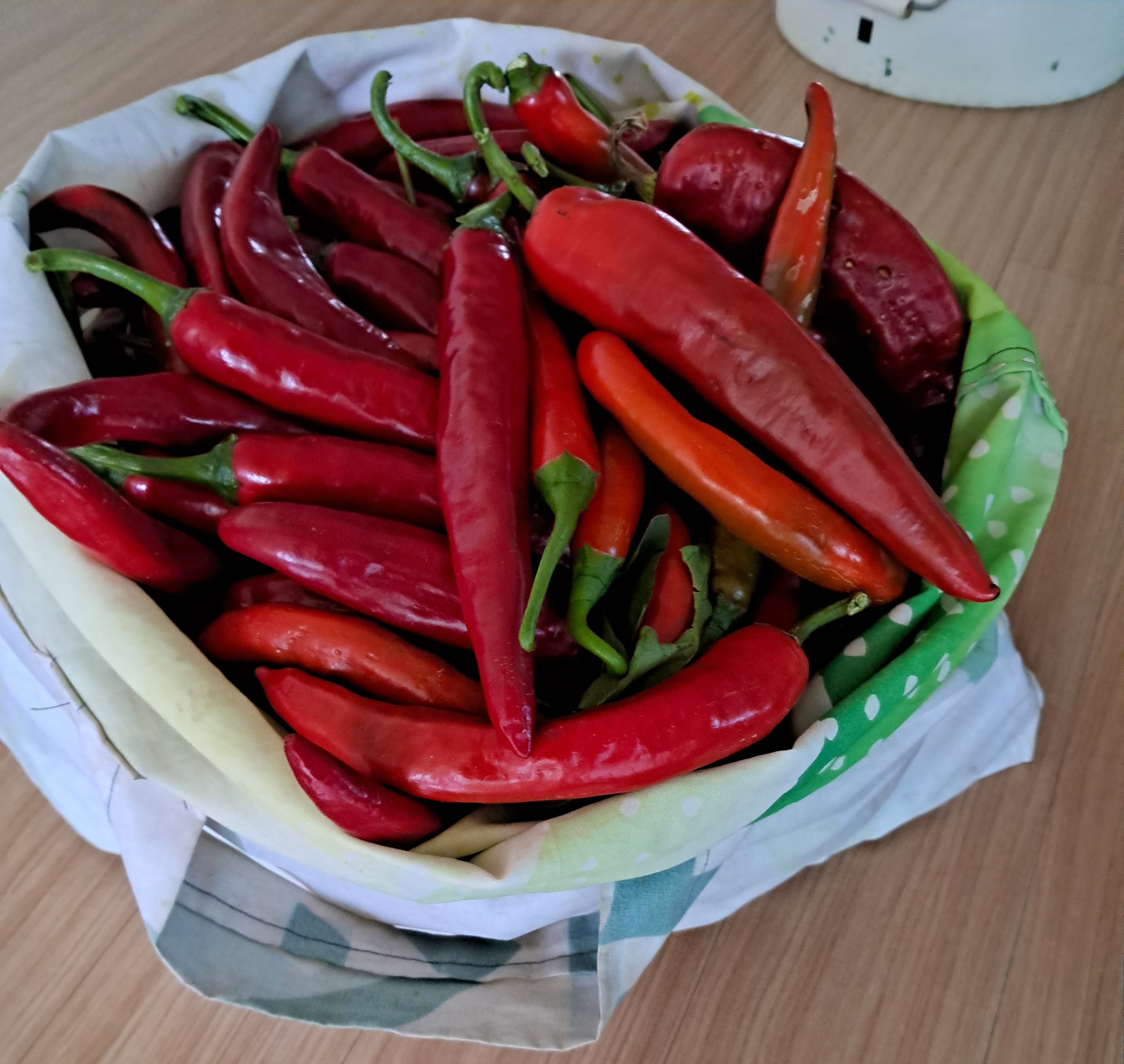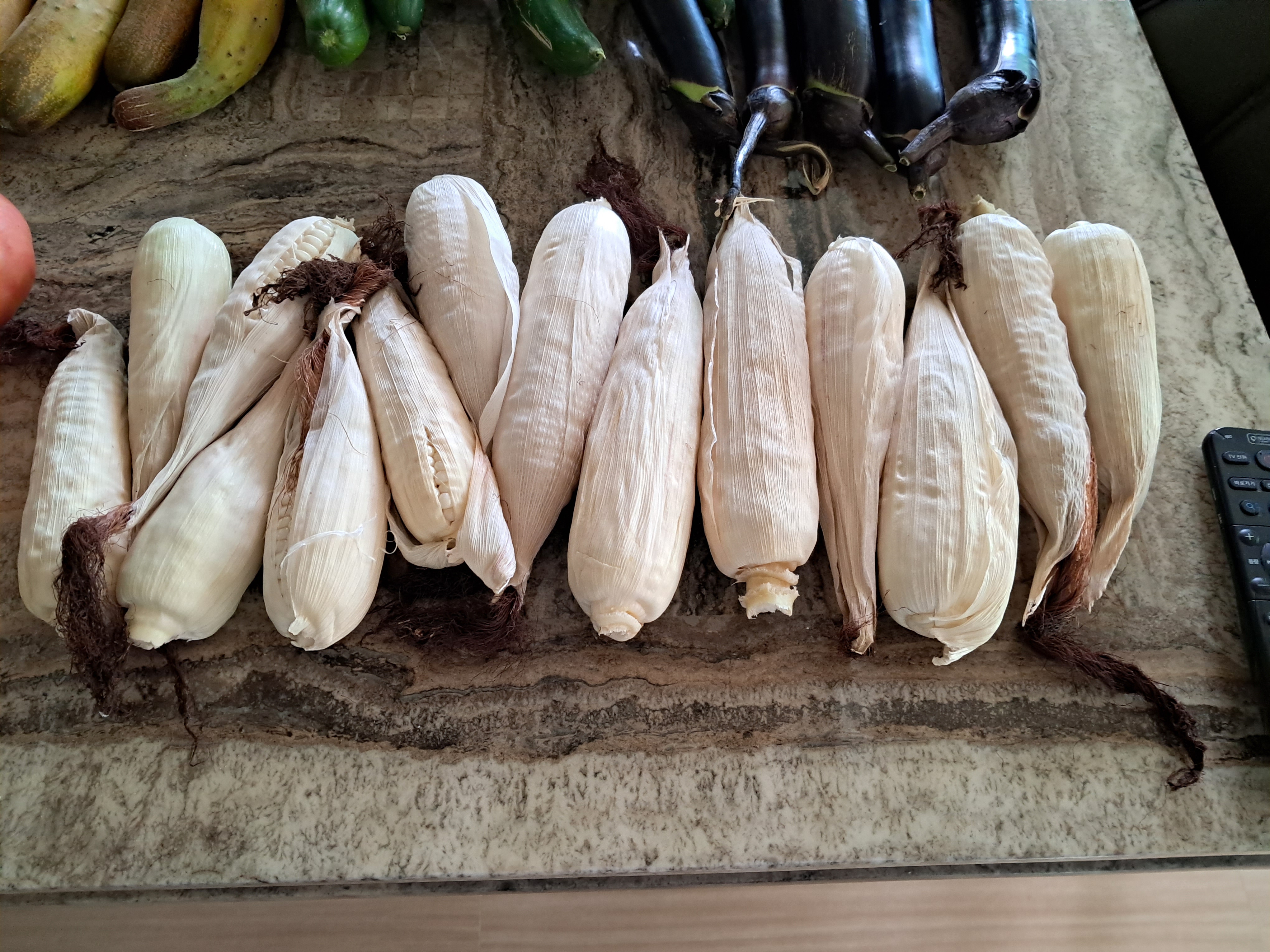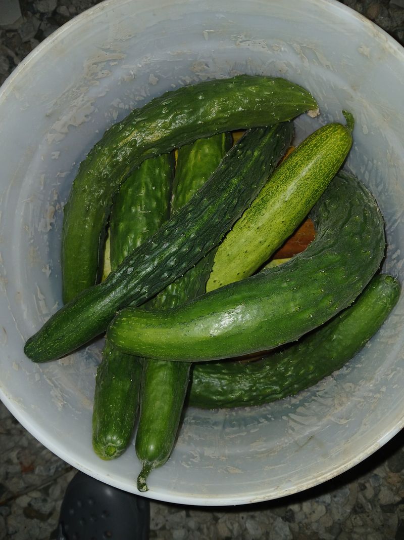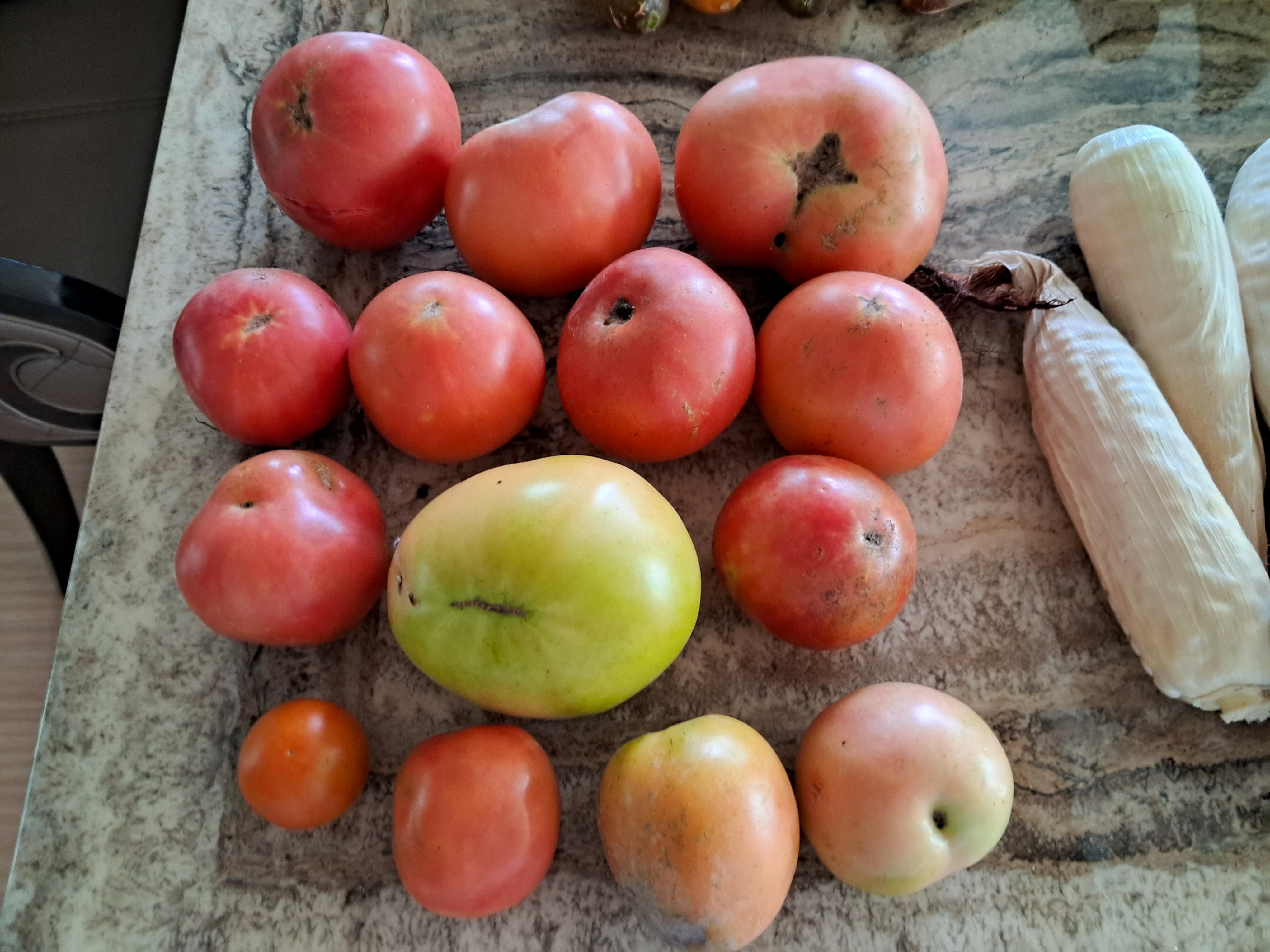 붉은 고추 한 포대 따고, 가지 5개, 흑진주 오이 5개. 노각 5개, 토마토 10여개, 옥수수 10여개 땄다. 잡초를 조금 뽑다가 너무 더워서 철수했다.