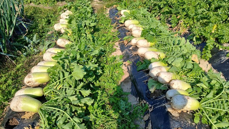 지난번에 무를 뽑고 25포기를 남겨 두었다가 오늘 다 뽑아서 땅에 묻어두려다가 주위에 나눠주고 먹기위해 다 가져왔다. 무가 튼실하게 너무 잘 자라서 싸게 팔기는 아깝다.
