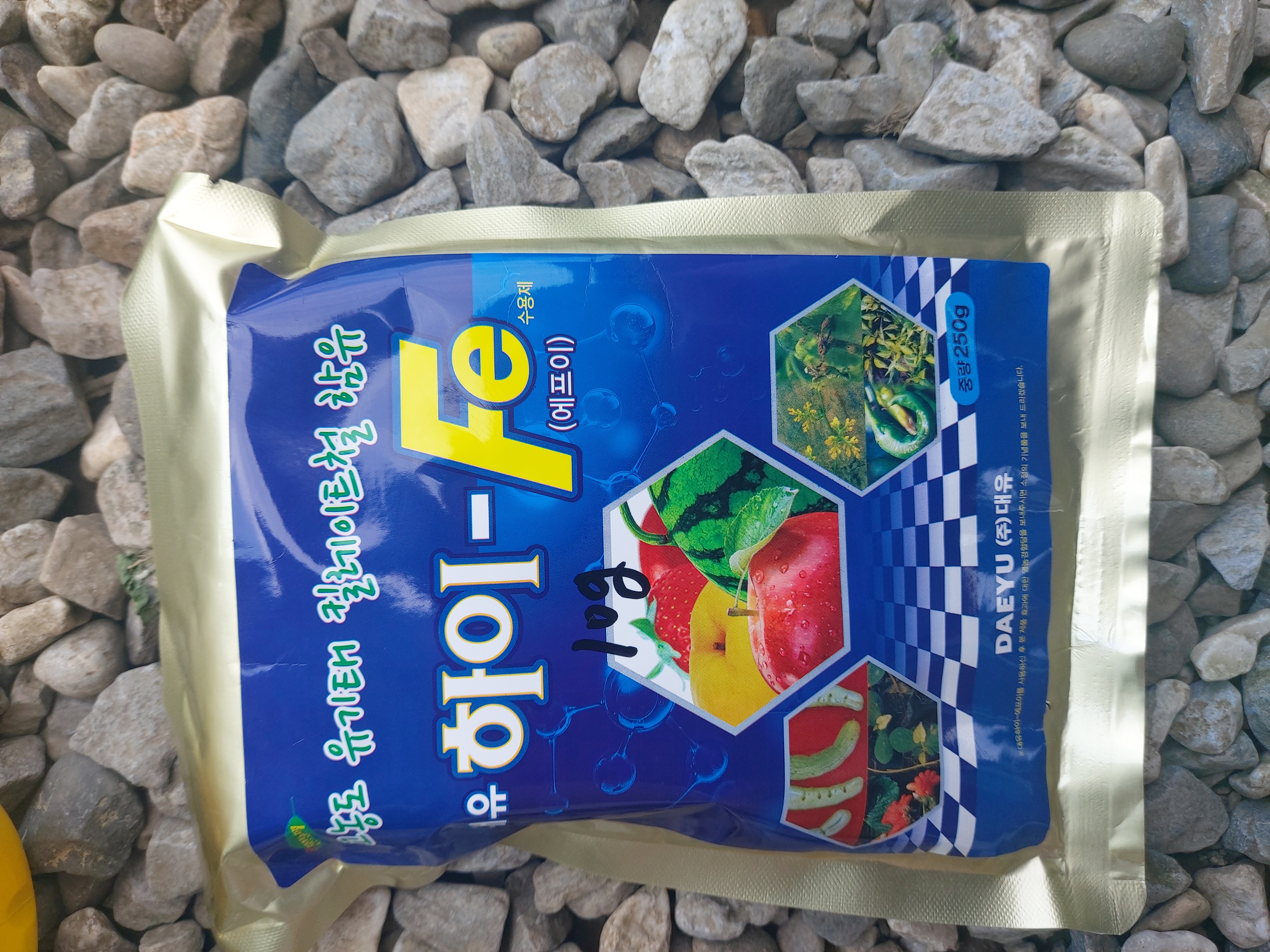 포도밭 윗쪽에 금년도 1차로 신규 구입 Fe 성분, 고농도 유기태 킬레이트 철 함유제 인 "대유 하이-Fe" (포도잎 황변 현상-마그네슘, 철 부족)를 20리터 분무기내 10g(1숟갈과 추가로 조금 더) 정량 넣고 20리터 2통 살포함 (18:35~19:50) 일주...