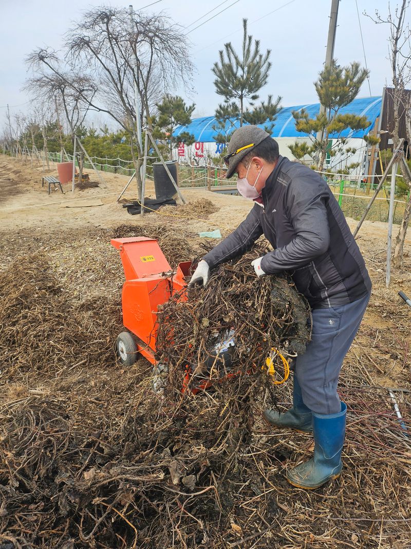 전지나무가지 및 고구마 줄기 코스모스등 파쇄 잔디밭 카소론 살포