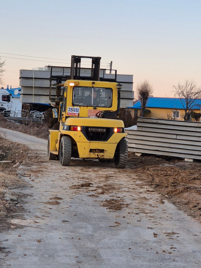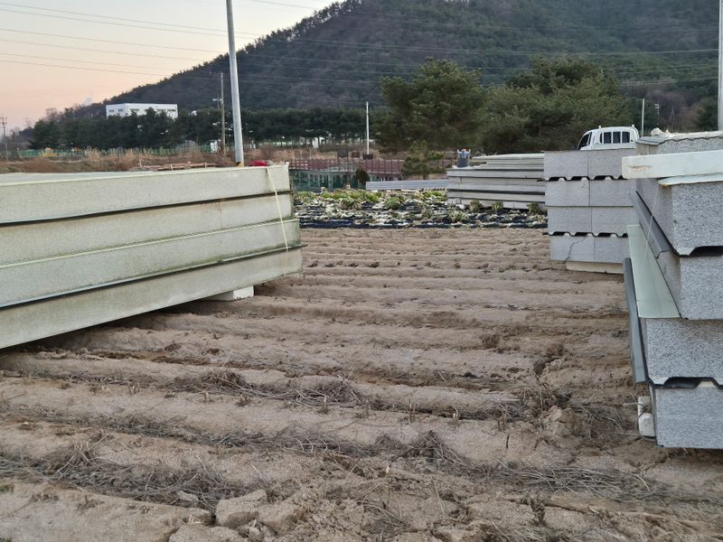 농촌체류형 쉼터 축조자재 반입 겉에 흙은 얼었다 녹아서 화물차와 지게차가 판넬하차하는데 어려움이 많았다.아주 추운날 작업할걸 후회 막급~ 아직도 밭에 남아 있는 배추들이 안타깝네요~~^^