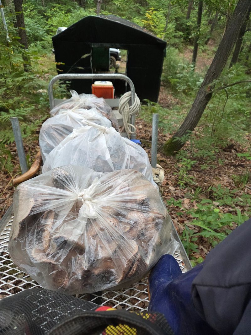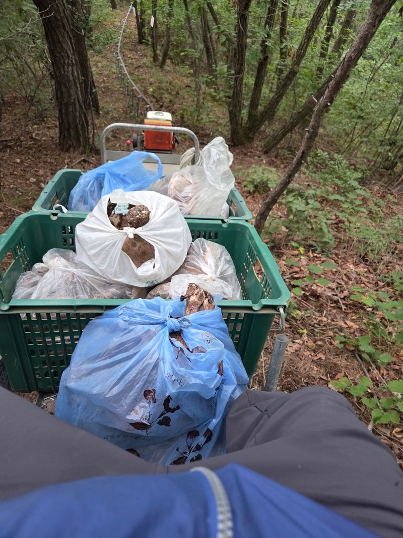 올가을 최고에수입 능이버섯채취를한는중입니다 국내유일 우리농장에서만 임산물채취을하여 모노레일 대차로 운반중 입니다
