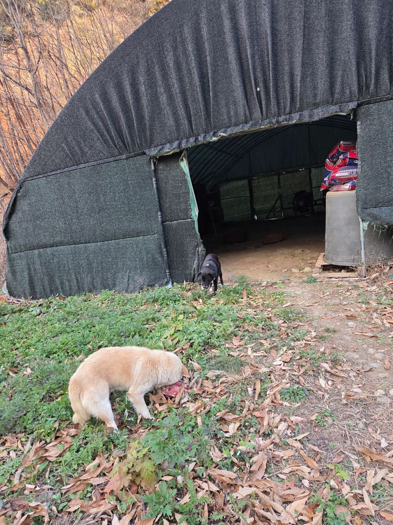 오후한가한시간에 올가을 송이능이 도독놈들을 경비서느라 고생한 검둥이 백구 겨울살이 준비와무주육류백화점에서 부설물을 주었드니 생오 닭을맞있게 먹고 있네요
