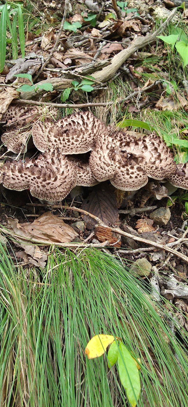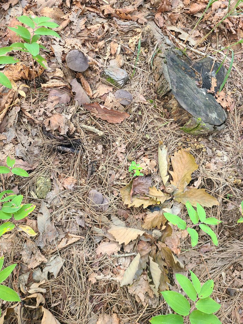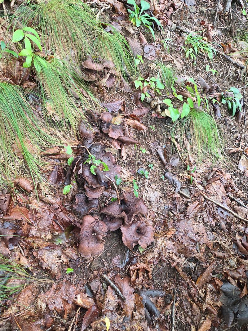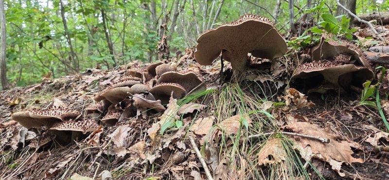 송이밭옆 참나밑에 따발이버섯이 만이피었네요 참나에서서식하는버섯은 독성이없어 다먹을수있답니다 잡버섯찌게에 너어서여러가지버섯과되지고기찌게를하면명품 입니다