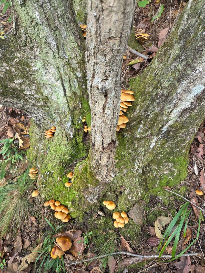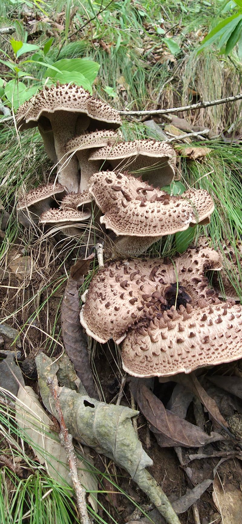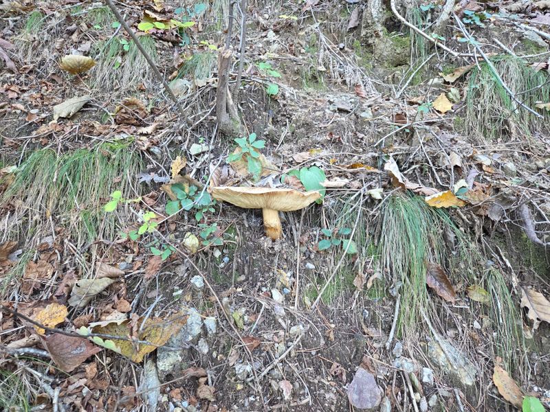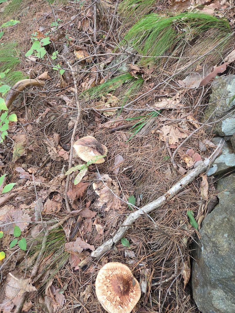 송이밭옆 참나밑에 따발이버섯이 만이피었네요 참나에서서식하는버섯은 독성이없어 다먹을수있답니다 잡버섯찌게에 너어서여러가지버섯과되지고기찌게를하면명품 입니다