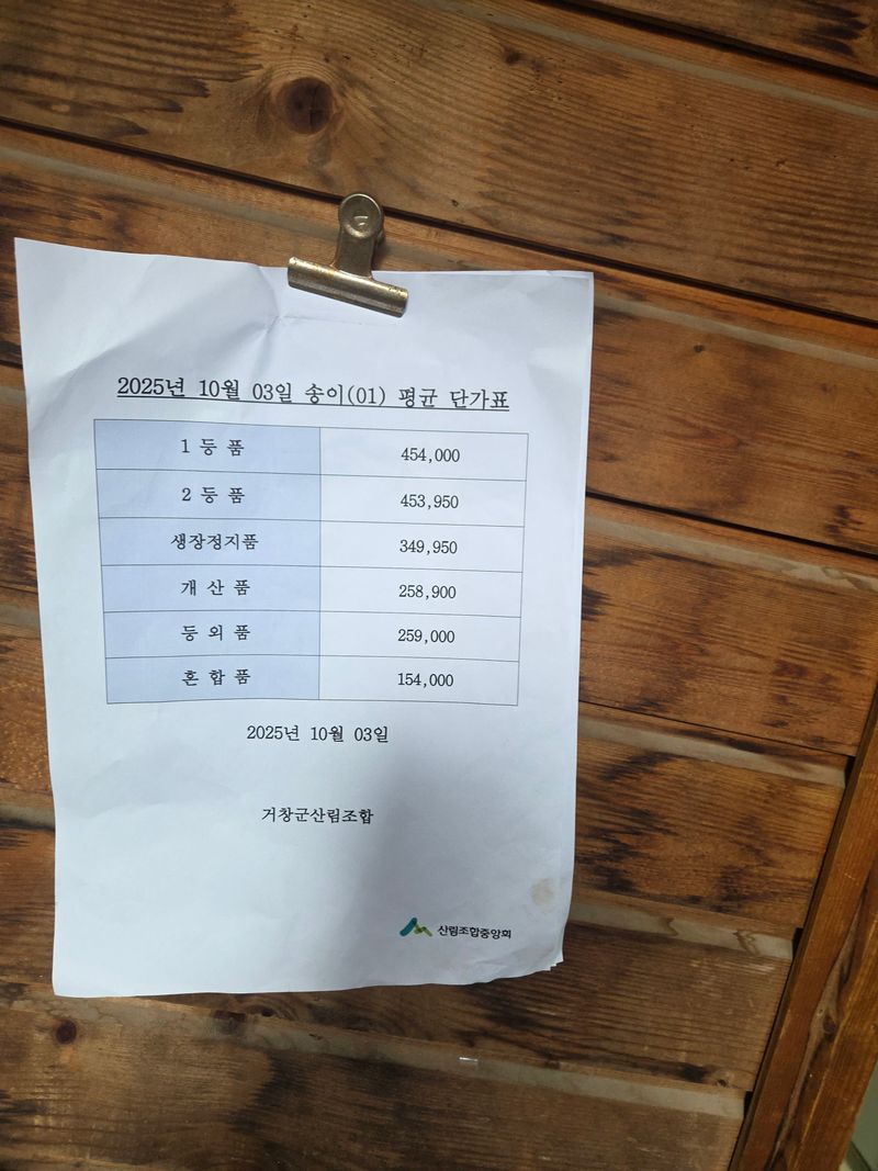 오늘은 지인에말을 듯고 거창산림조합에 송이판매을 하려고갖읍니다 몆칠전 입찰가격입니다 판매처가 없어 고민이었지만 많은양을 판매알수가 있어서 감사합니다