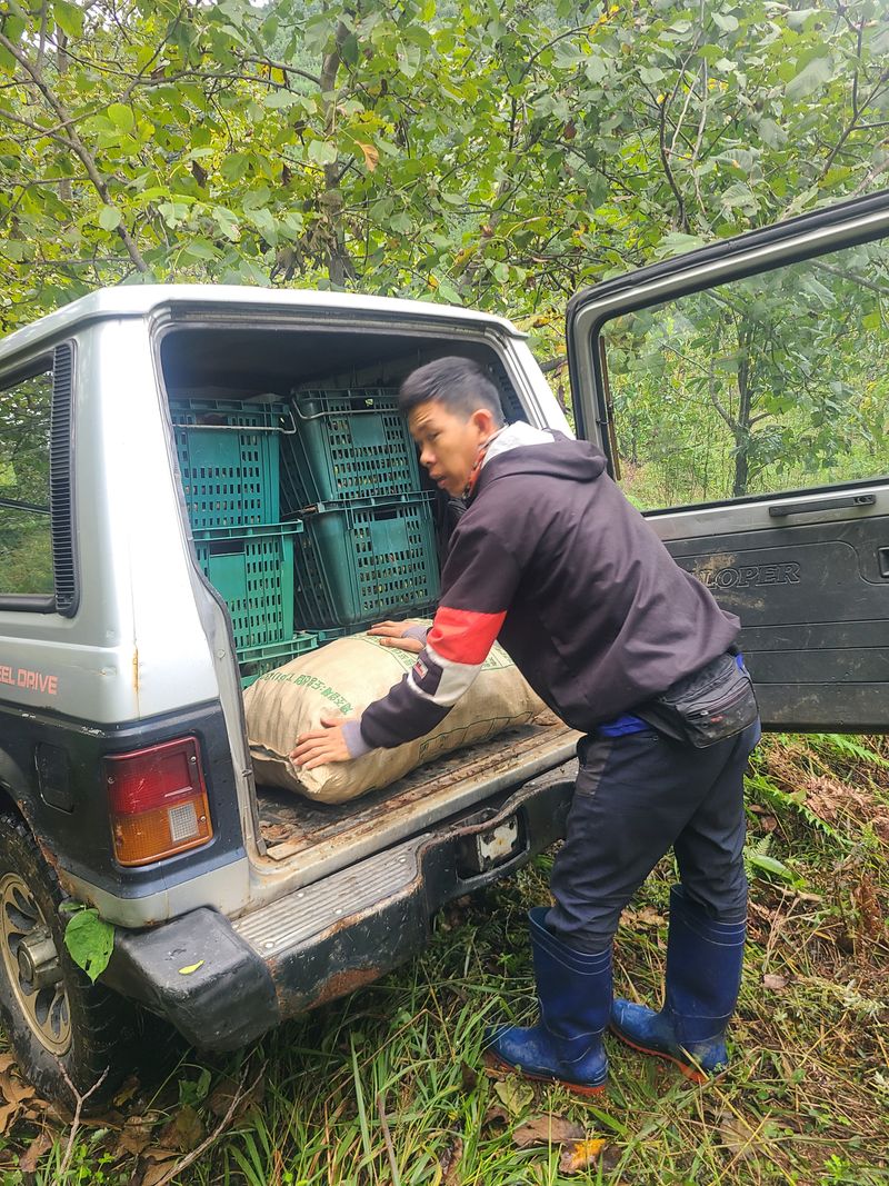 호두를 장대로털어 노은호둔슬 자동차로운반하는 중입니다