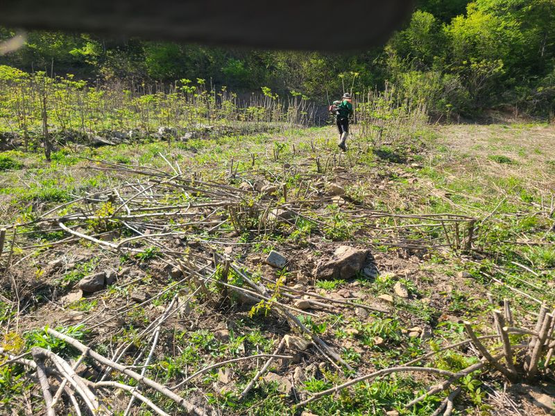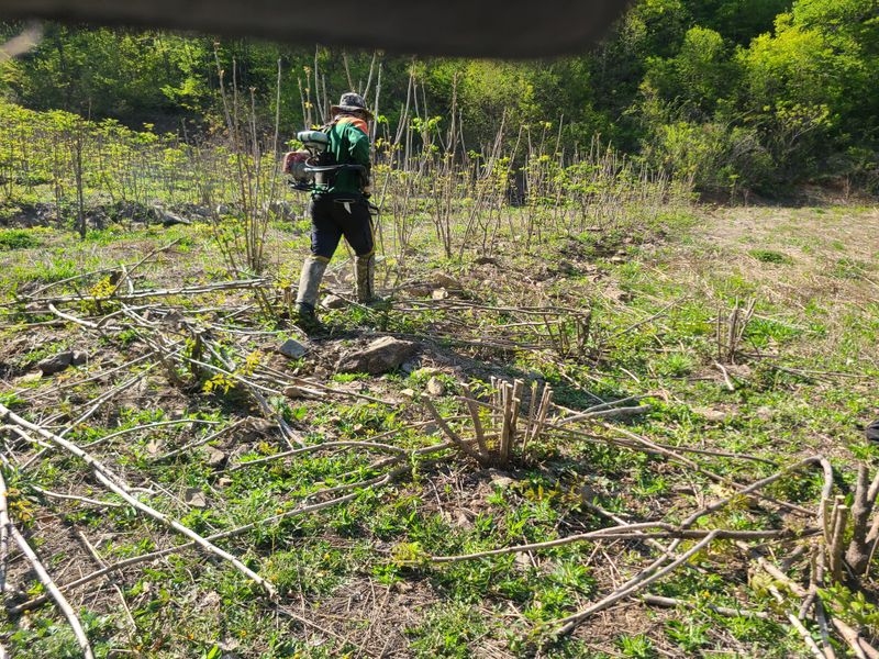 봄나물두릅나물을 채취후 묵은대을 예초기로자르는 작업중입니다 묵은대를자르면신초가튼튼히 잘올라와내년에수확하면 좋은 상품을 생산한다내요ᆢ