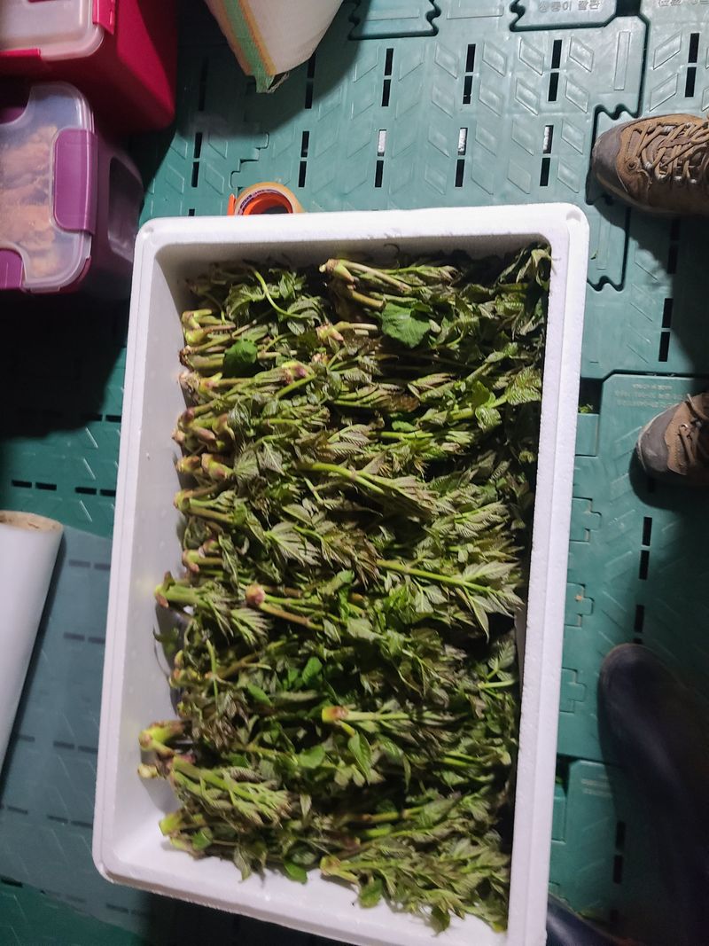 두릅수화한 저온창고에서 포장을하고있는 중입니다 수확후 판매한 돈이들어올때 기분은 최고입니다