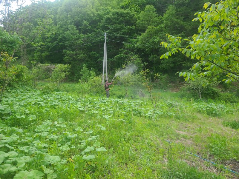 전에 예초작업을 했던호두나무 두릅나무밭에 제초제를 살포하고 있읍니다 장마비가 심술을부려서 3일을쉬었읍니다 쉬는시간에 영농일지를 쓰는중입니다 장덕리산54-1
