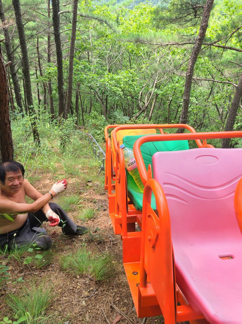 모노레일점검을 다마쳤읍니다 구리스가 레일기어에서 떨어진것을 수거하고있읍니다 자연산송이능이 밭에기름이 있으면 버섯밭에 치명적 피해를볼수있답니다