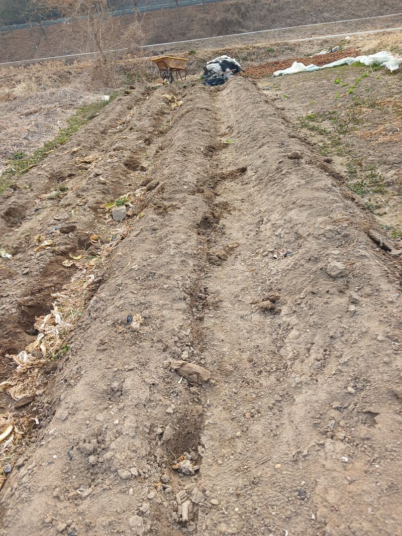 감자 심기 위한 고랑 만들고 밑거름으로 햇토비를 넣고 비오기만 기다립니다 비오고 나면 비닐멀칭 작업 할려고요