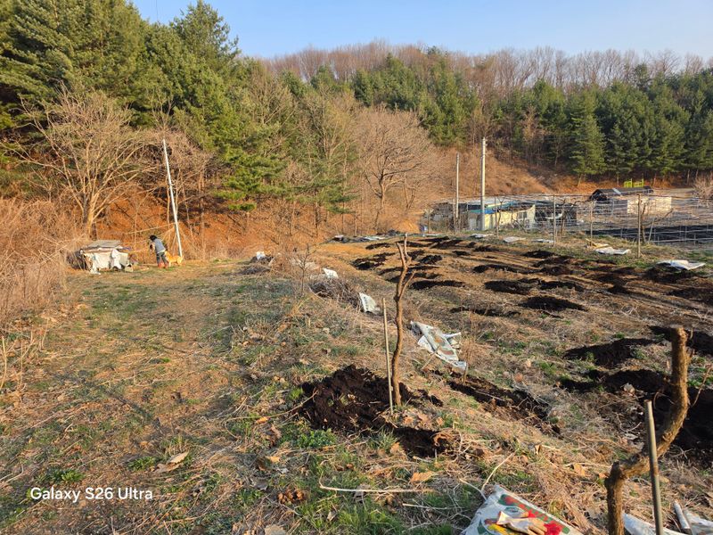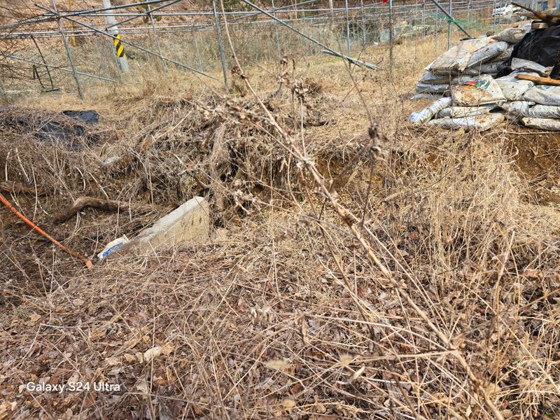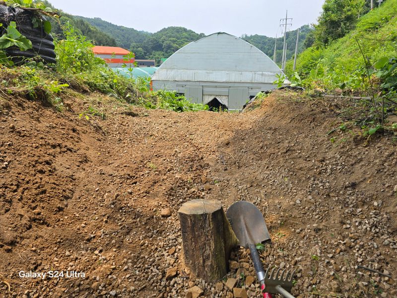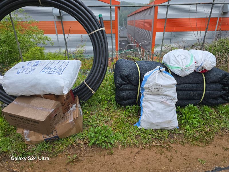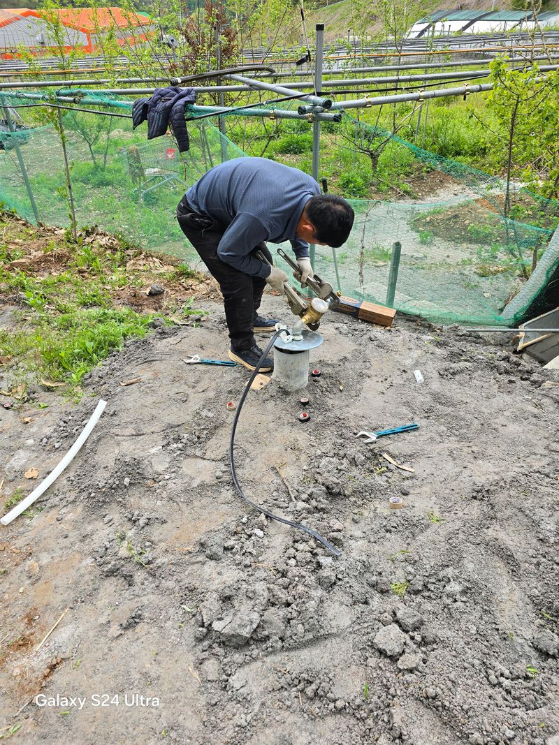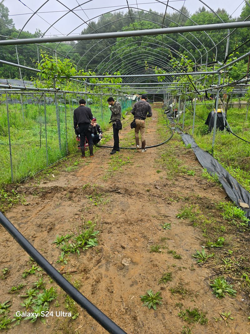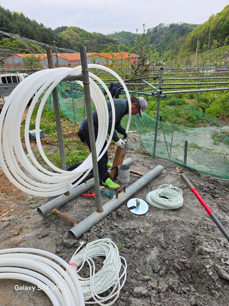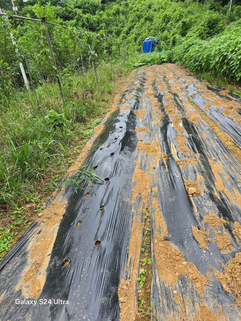 다래밭 관수 오전5시 농약살포 윰관 800m.m 산에서 내려오는물 수용공사. 윗 산주 공사