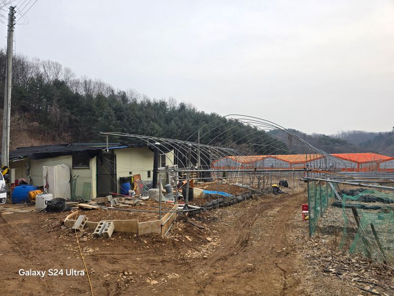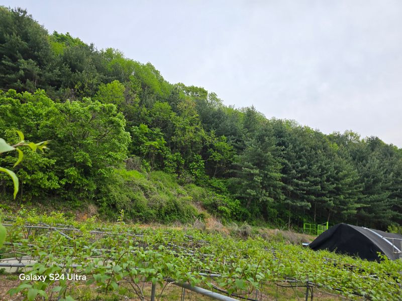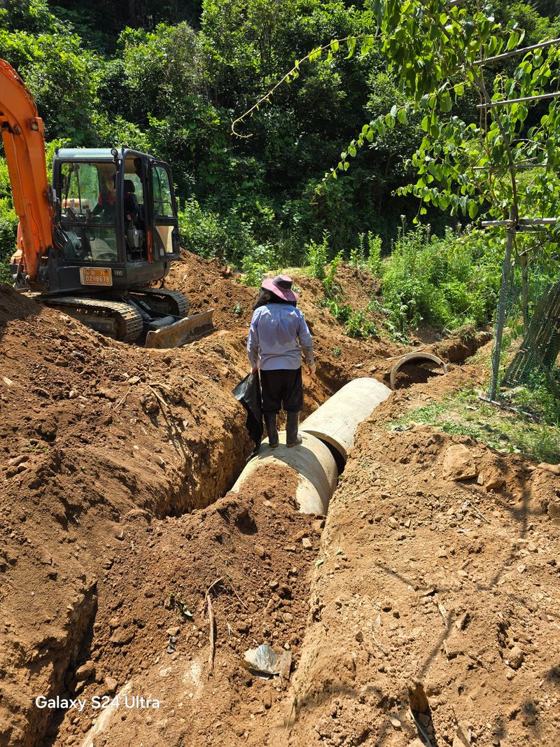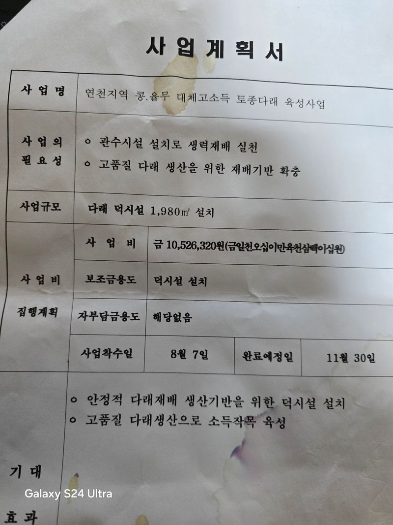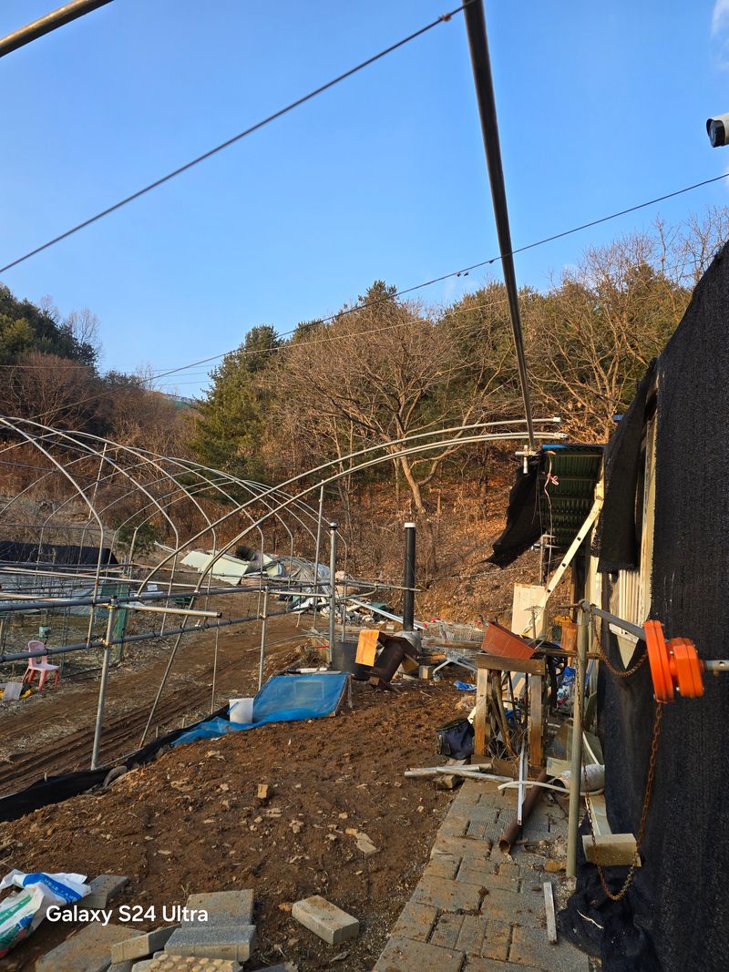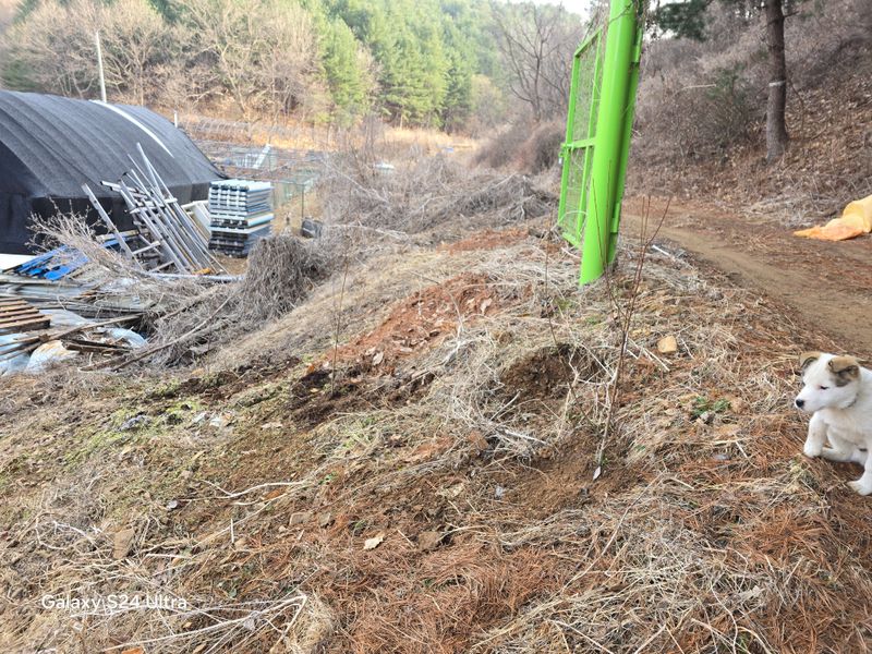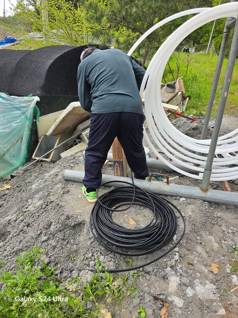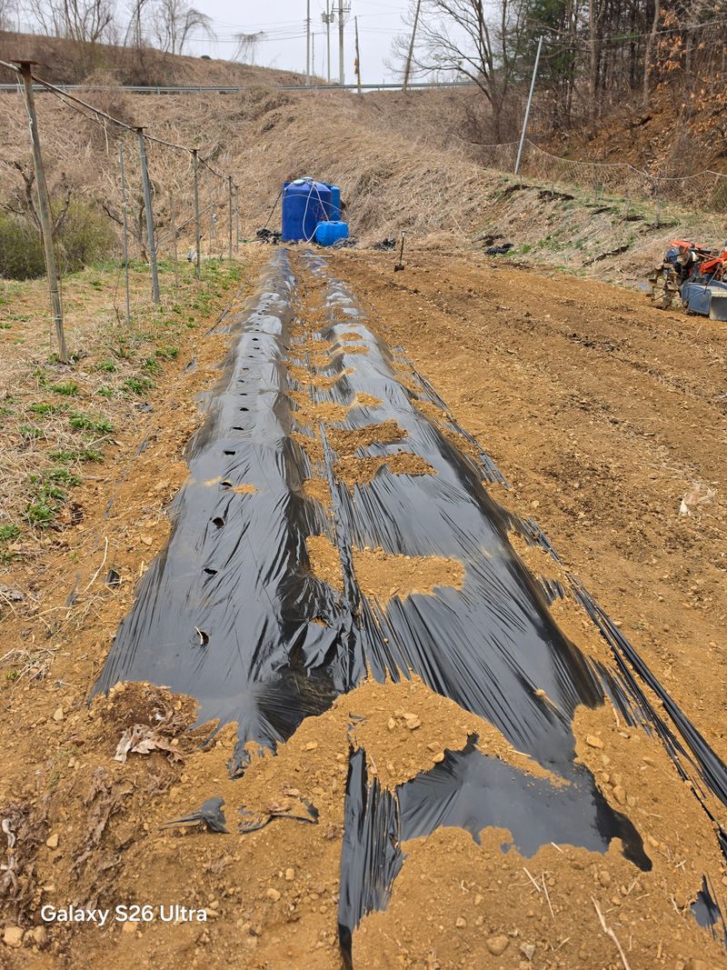 다래밭 관수 오전5시 농약살포 윰관 800m.m 산에서 내려오는물 수용공사. 윗 산주 공사