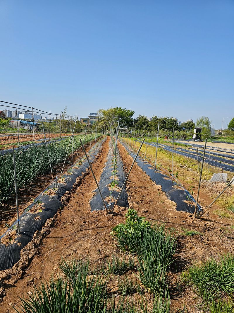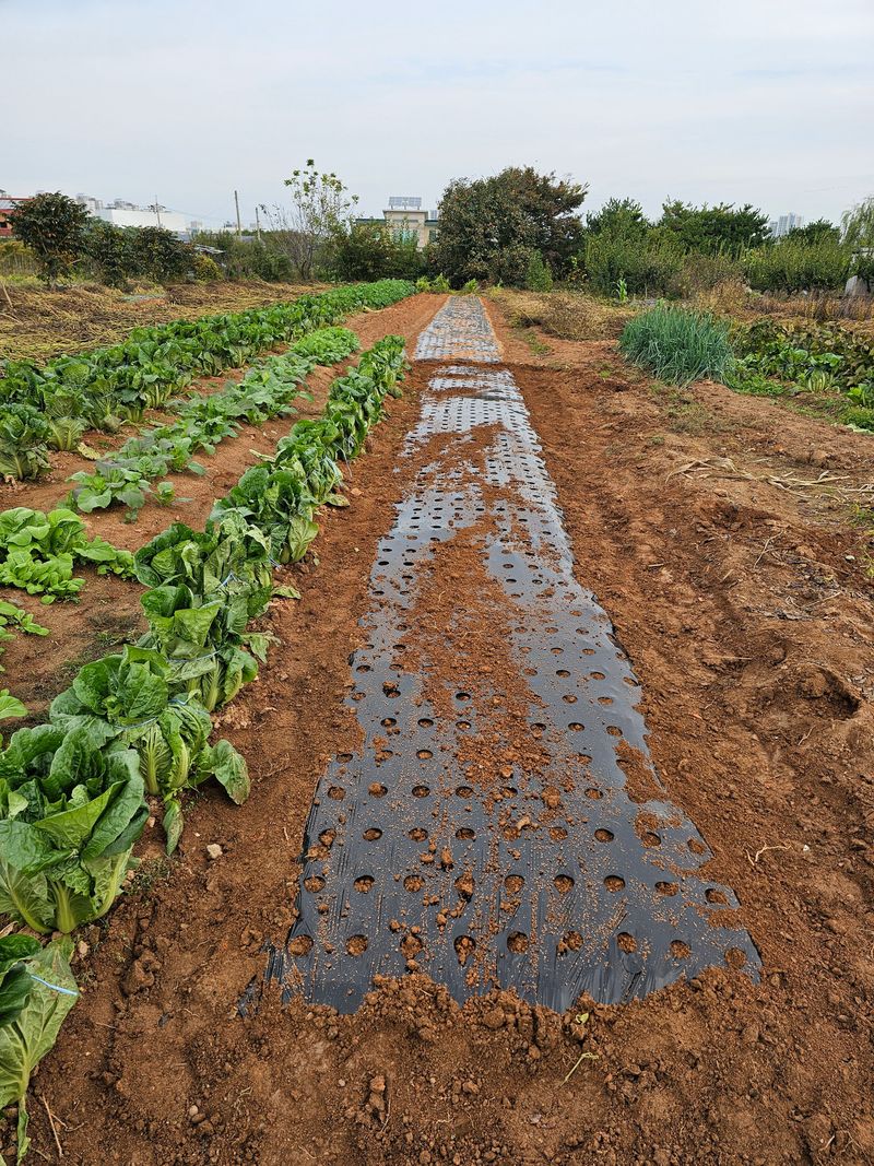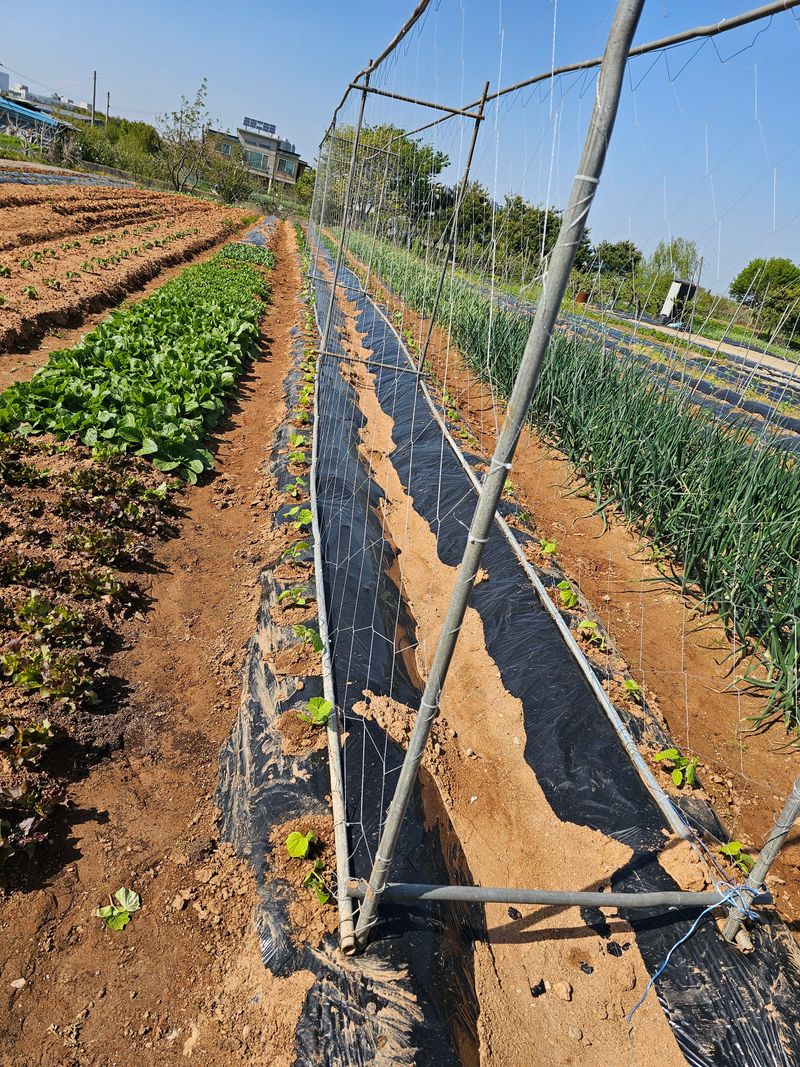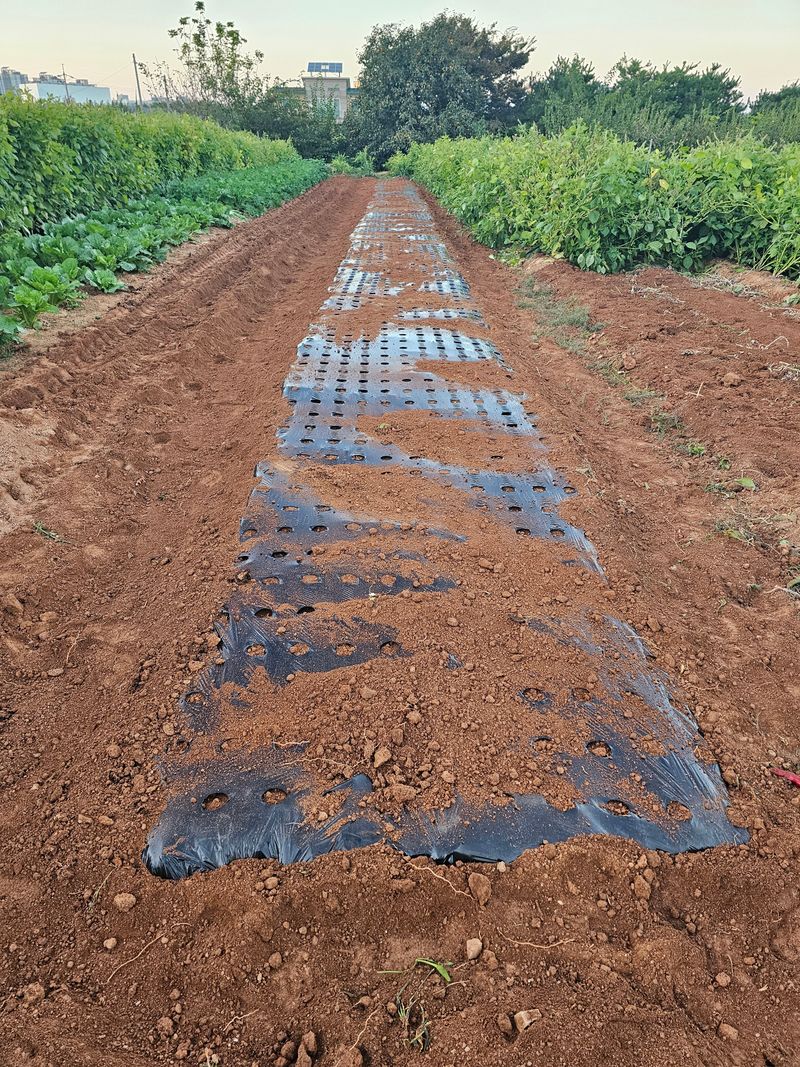 마늘밭 경운 및 멀칭비닐 피복 + 비료 : 미생물밭비료, 칼슘유황비료 + 농약 - 토양살충제 : 사령탑 입제 - 토양살균제 : 스포르곤 입제 + PE비닐 - 마늘유공(폭 150cm, 11공)