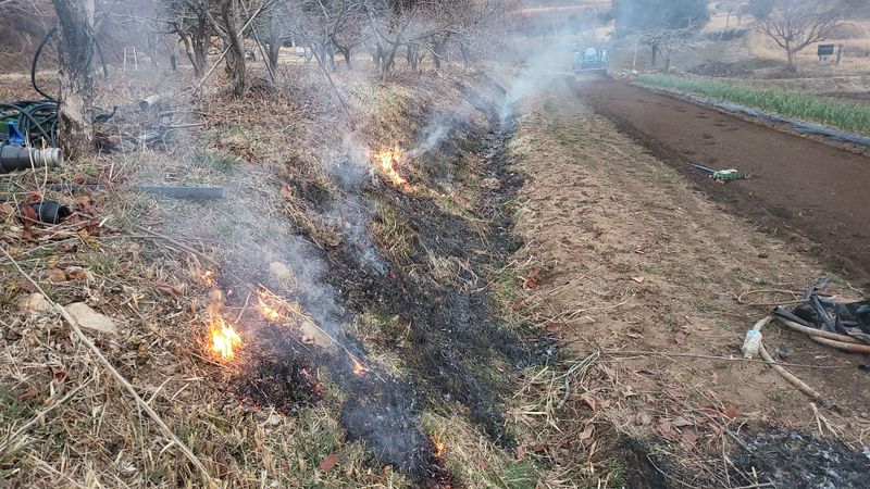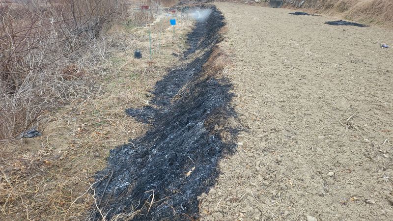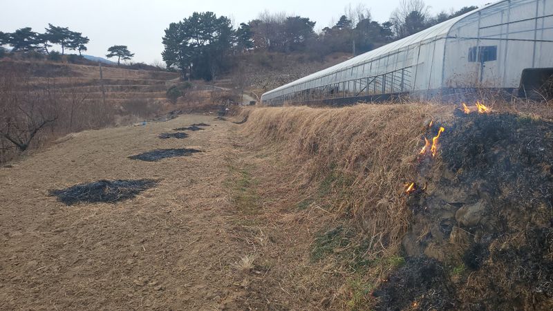 밭두렁 예초작업하여 모아서 불태우기, 저기압때 불조심하면서 소각하여 칼리성분도 확보하고 쥐의 집도 없애고 농장주변정리도 함