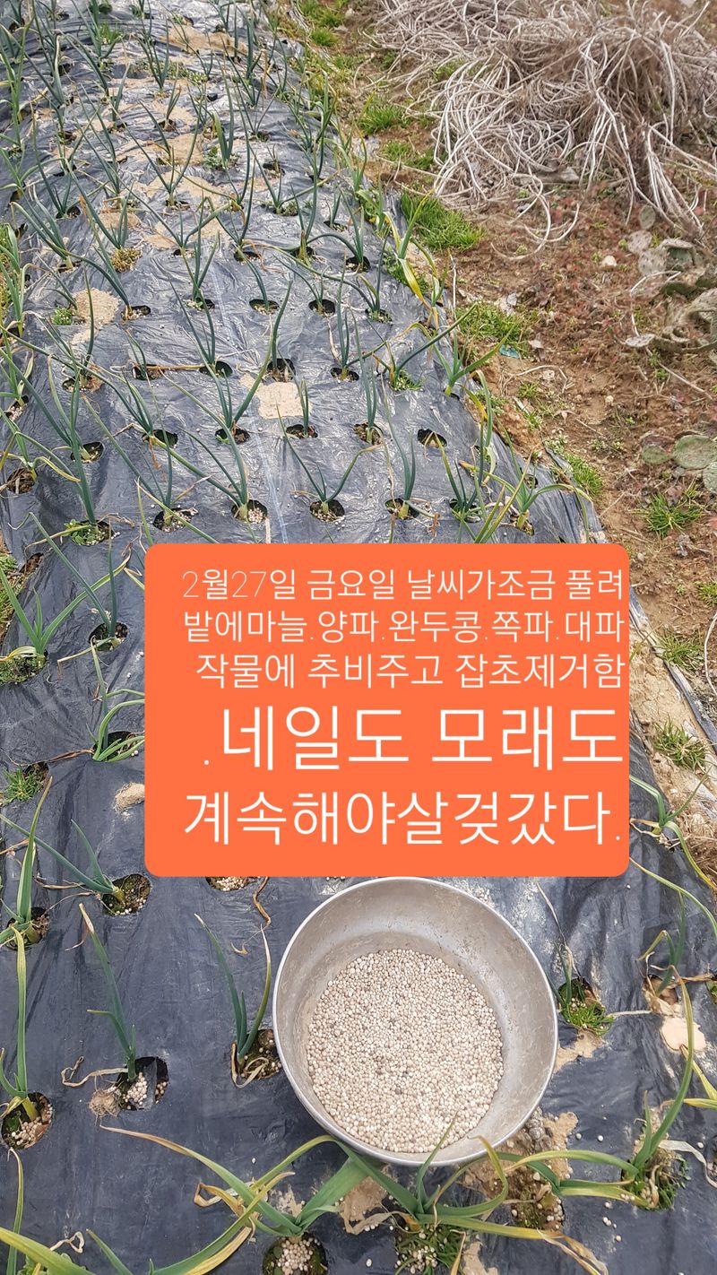 날씨가 풀려 마늘.양파. 대파. 완두콩.쪽파밭에1차추비줌 잡초재거 3일은 계속해야 끝날것갖다.