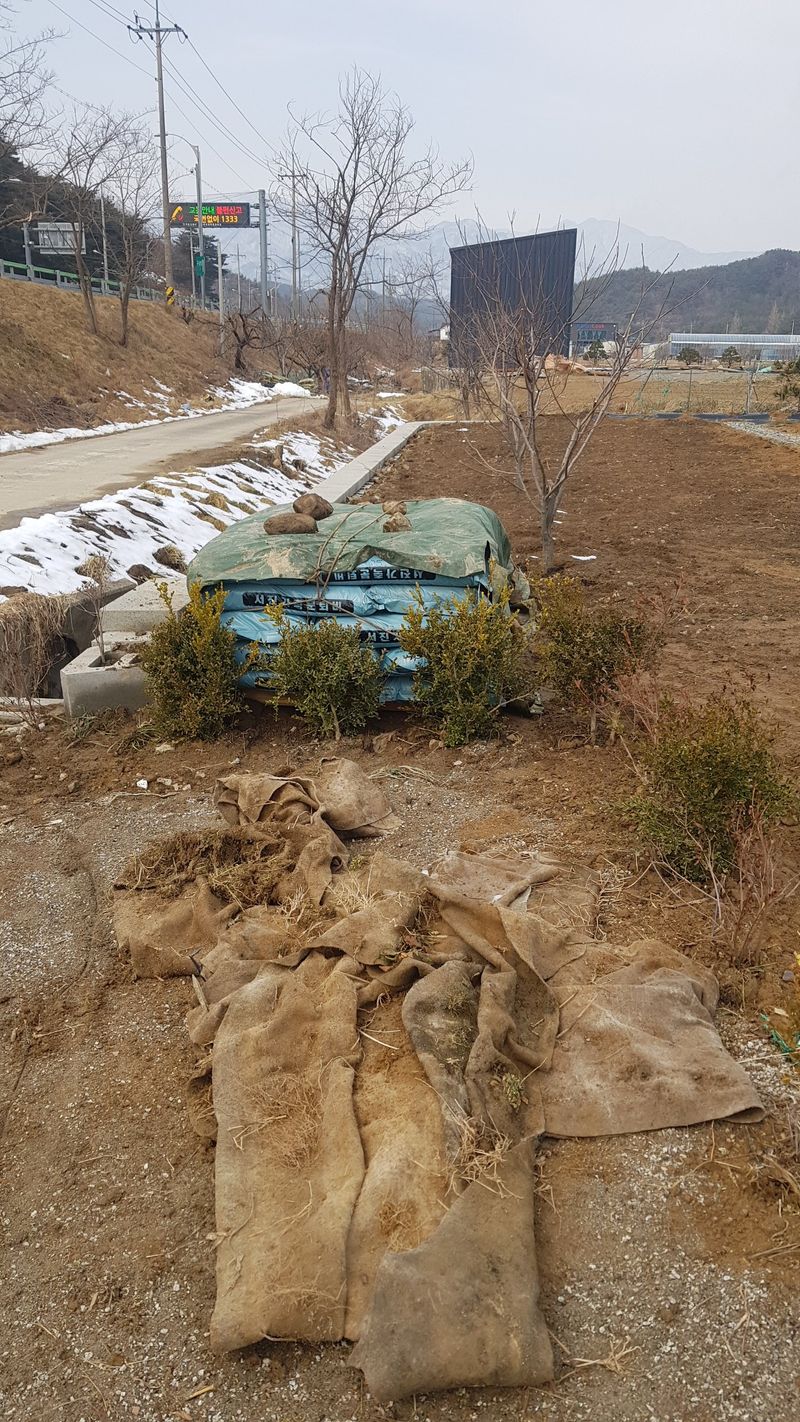 나무심기 (대추나무이식, 철쭉 이식, 회양목이식) 유박살포, 소똥그름 살포 밭 주차장 정리