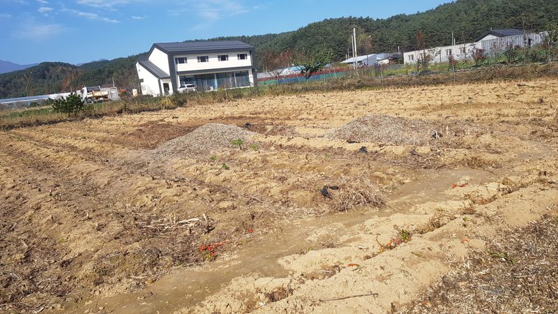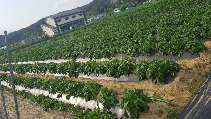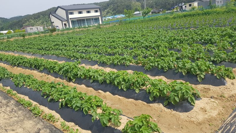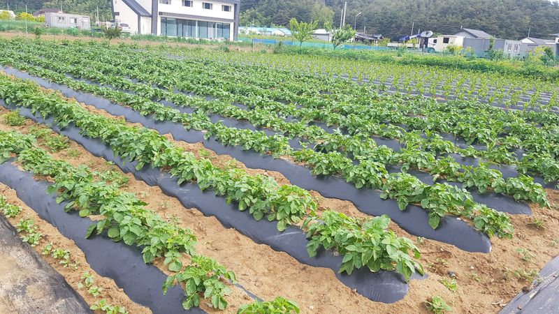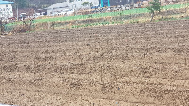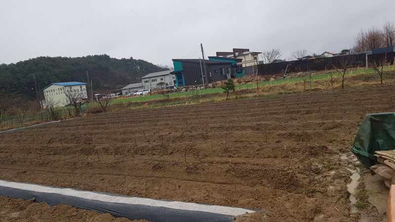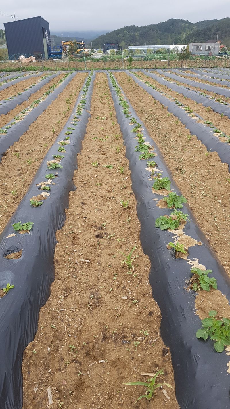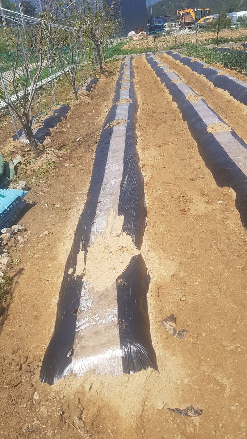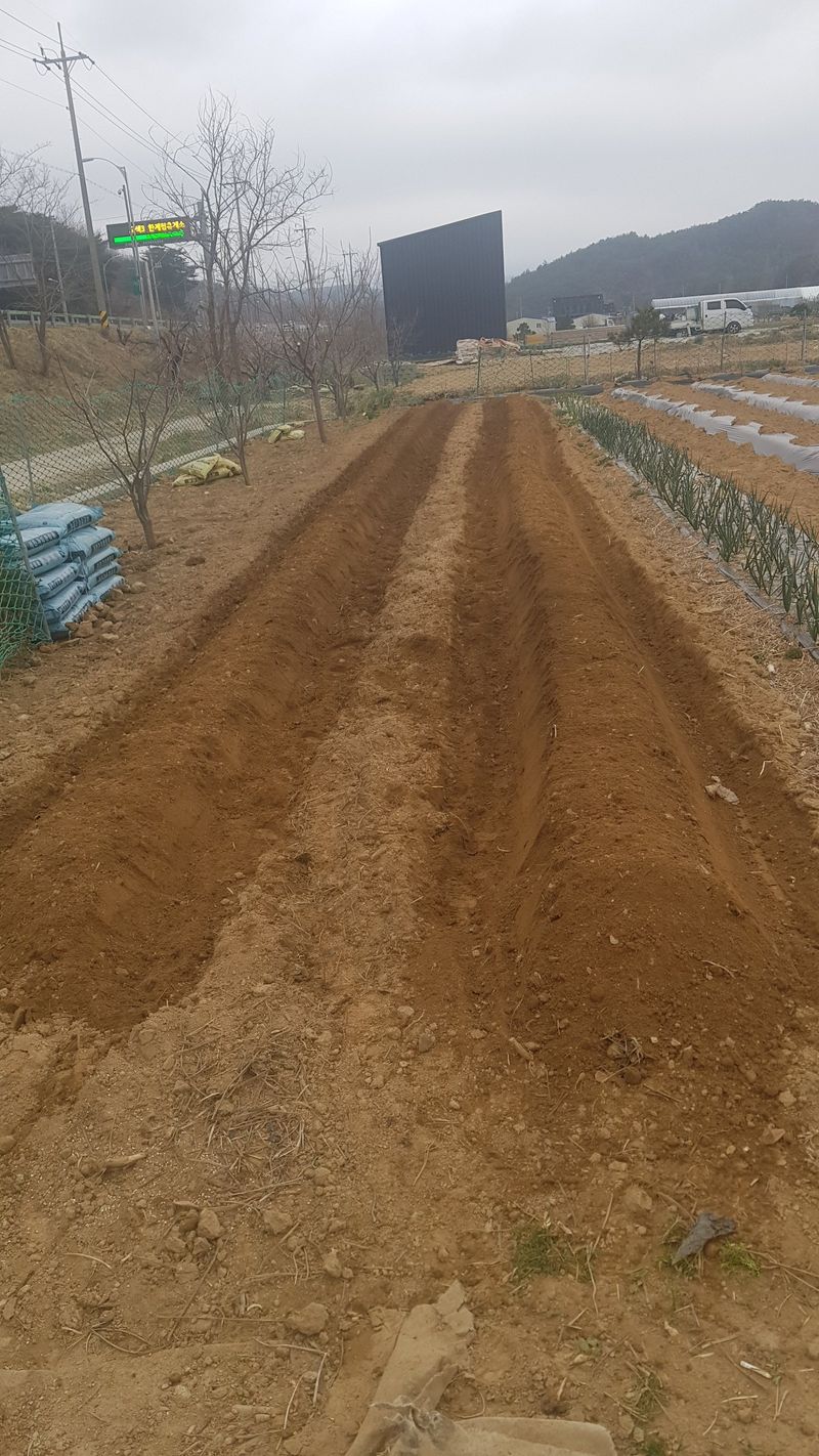 감자2고량 심기 옥수수 두둑 12고랑 만들고 비닐피복 고추두둑 4고랑 만들고 비닐피복 엄나무 두둑 11고랑 만들기 고구마 두둑 2고랑 만들기